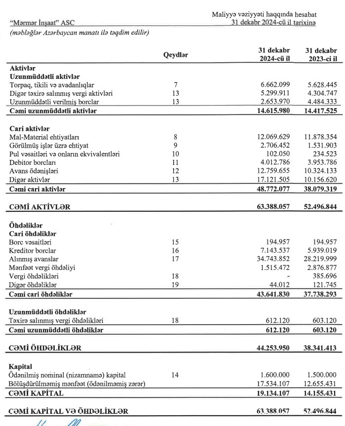 31 dekabr 2024-cü il tarixində "Mərmər İnşaat" ASC 63 milyon 388 min manat cəmi aktivlərə malik olub. Şirkət 2023-cü ilin sonunda 52 milyon 497 min manat cəmi aktivlərə malik idi (10 milyon 891 min manat və ya 20,7% artıb).
