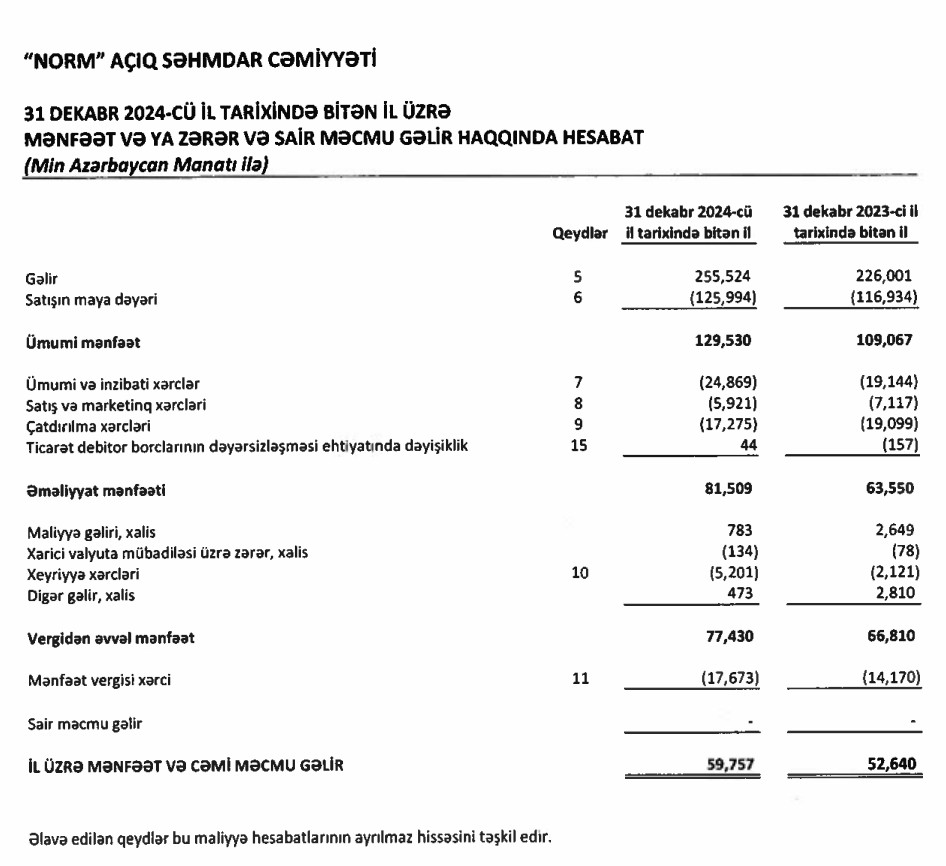 Ötən il "Norm" şirkətinin 256 milyon 824 min manat cəmi əməliyyat gəlirlərinə qarşı cəmi əməliyyat xərcləri 179 milyon 394 min manat, gəlirlər xərcləri üstələdiyindən əməliyyat mənfəəti 77 milyon 430 min manat təşkil edib. Şirkət əməliyyat mənfəətindən 17 milyon 673 min manat mənfəət vergisi ödəyib ki, bu da 2023-cü illə müqayisədə 3 milyon 503 min manat və ya 24,7% çoxdur.