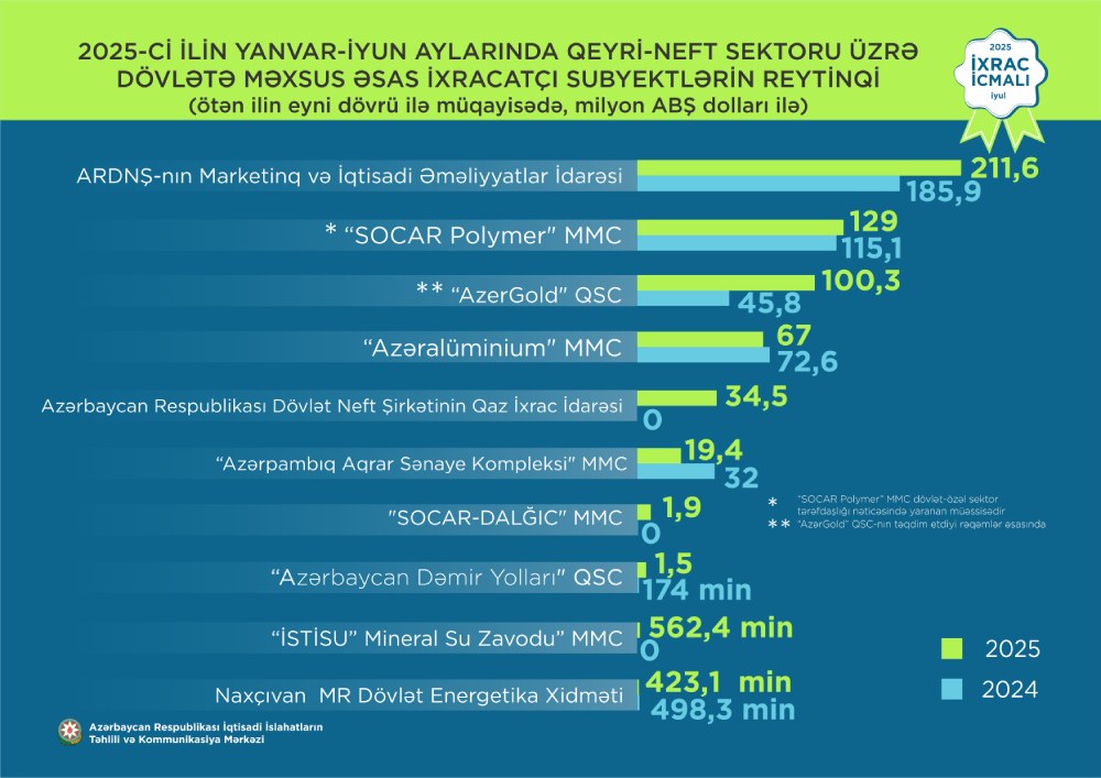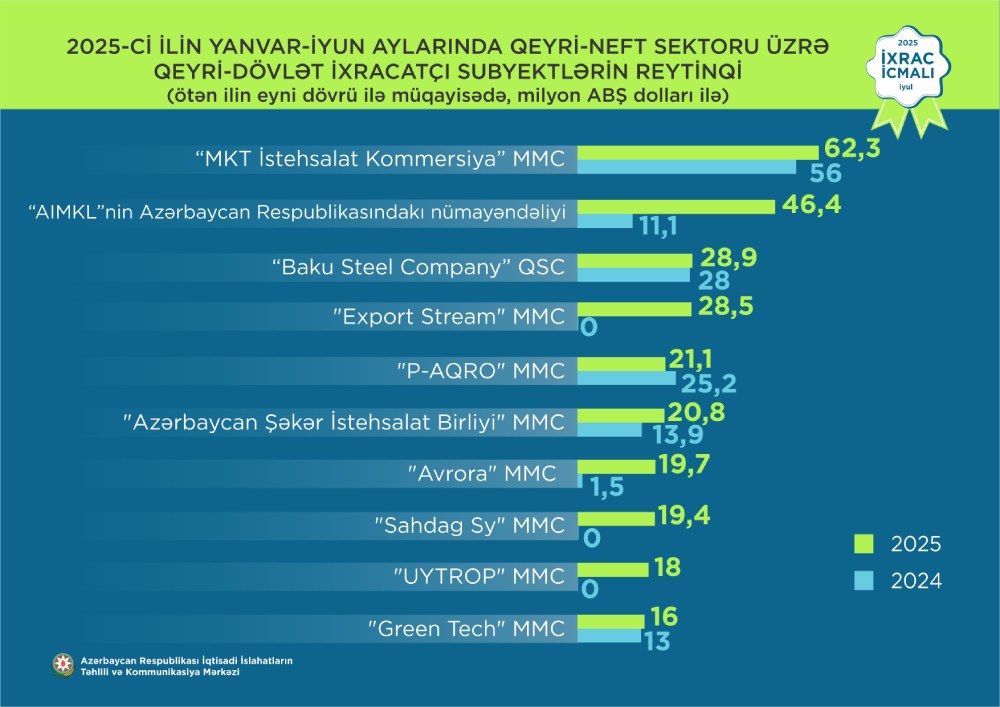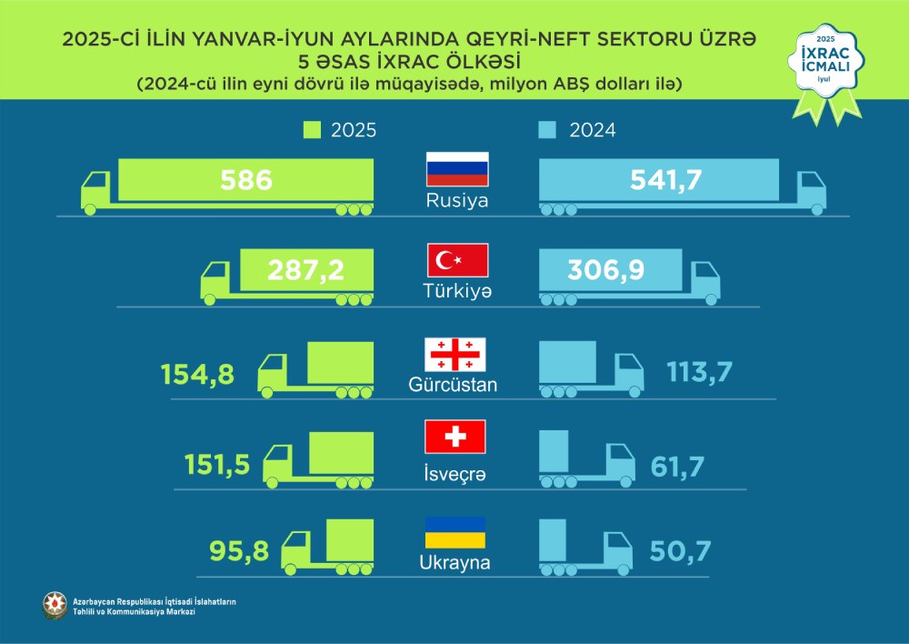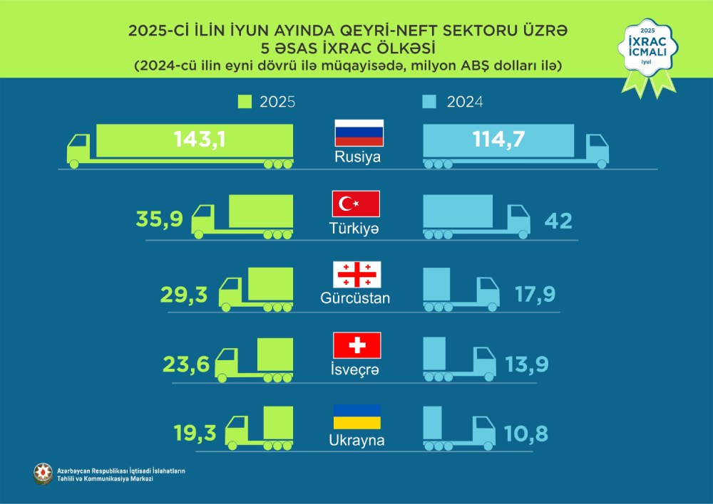 2025-ci ilin iyun ayında Rusiya Federasiyasına 143,1 milyon ABŞ dolları, Türkiyəyə 35.9 milyon ABŞ dolları, Gürcüstana 29,3 milyon ABŞ dolları, İsveçrəyə 23.6 milyon ABŞ dolları, Ukraynaya isə 19,3 milyon ABŞ dolları dəyərində qeyri-neft sektoruna aid mal ixrac edilib.