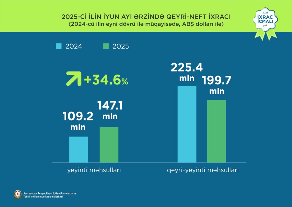 İcmala əsasən, 2025-ci ilin yanvar-iyun aylarında Azərbaycanın qeyri-neft sektoru üzrə ixracı 2024-cü ilin müvafiq dövrü ilə müqayisədə 9.9% artaraq 1,8 milyard ABŞ dolları təşkil edib. Bu dövrdə yeyinti məhsulları üzrə ixrac 19,1% artaraq 564.7 milyon ABŞ dollarına bərabər olub.