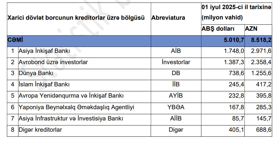 Azərbaycanın bu il iyulun 1-nə 5 milyard 10,7 milyon ABŞ dolları təşkil etmiş xarici dövlət borcunun 1,7 %-i və ya 85,7 milyon dolları Asiya İnfrastruktur və İnvestisiya Bankından cəlb edilmiş öhdəliklərin payına düşüb.