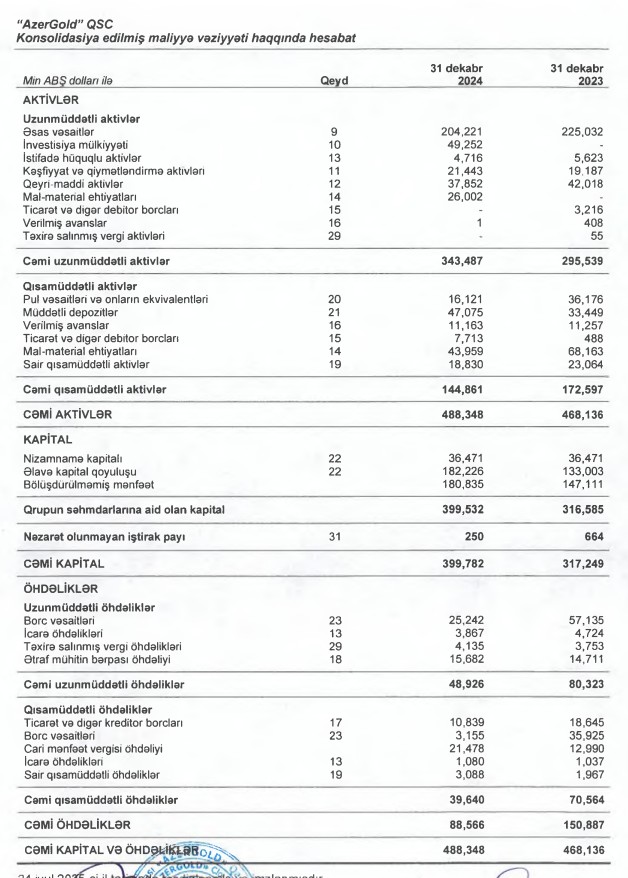 “AzerGold” QSC-nin və onun törəmə cəmiyyətlərinin 2024-cü il üzrə konsolidə edilmiş maliyyə nəticələri açıqlanıb.