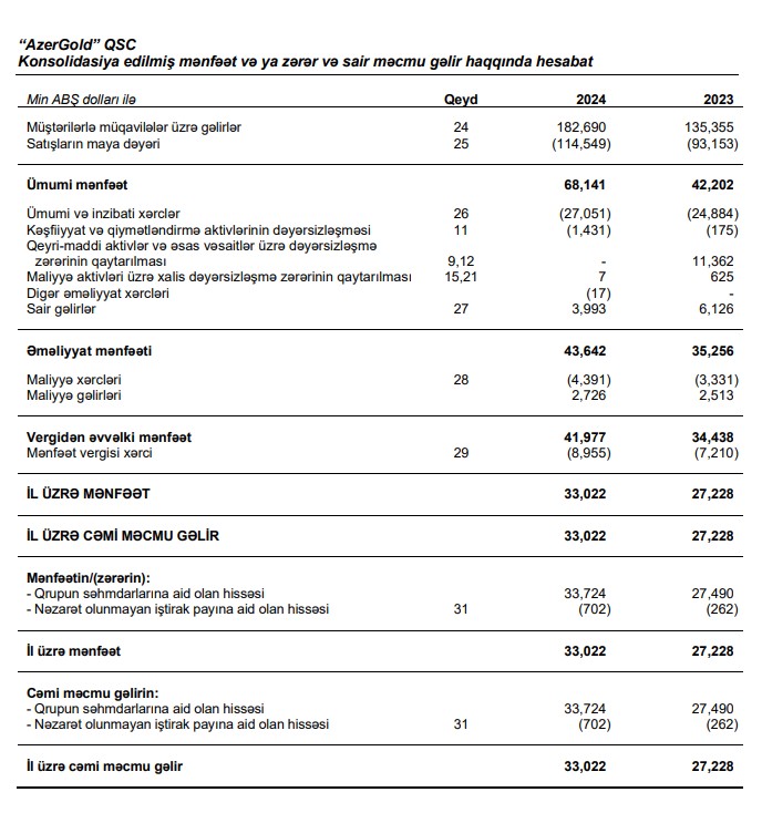 Marja.az QSC-nin hesabatlarına istinadən xəbər verir ki, 2024-cü il üzrə “AzerGold” QSC-nin və onun törəmə cəmiyyətlərinin (birlikdə – Qrup) konsolidə edilmiş maliyyə hesabatlarına “PricewaterhouseCoopers Audit Azerbaijan” MMC tərəfindən müsbət auditor rəyi verilmişdir. Cari maliyyə ilində konsolidə hesabatlara Qrupa daxil olan “AzerBlast” MMC və “Daşkəsən Dəmir Filiz” MMC-nin maliyyə göstəriciləri də daxil edilmişdir.