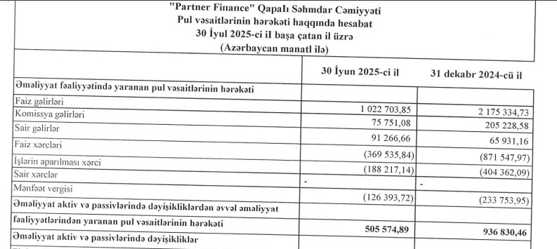 2025-ci ilin ilk 6 ayında "Partner Finance" faiz gəlirləri 1 milyon manatdan çox - 1 milyon 23 min manat təşkil edib.
