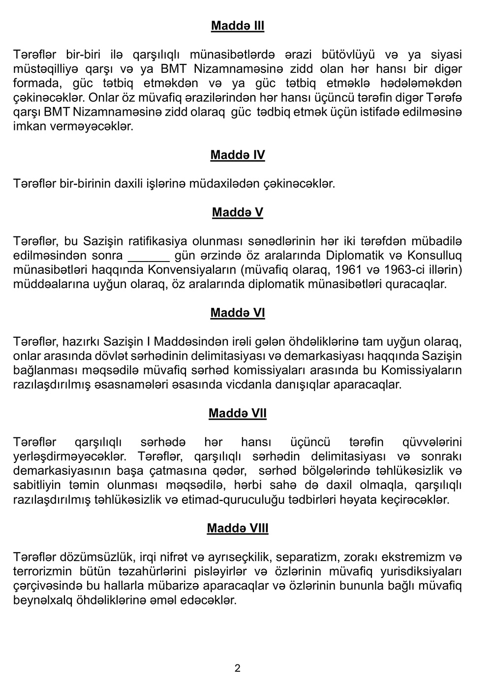 Tərəflər digər tərəfin ərazi bütövlüyü və ya siyasi birliyini tamamilə və ya qismən parçalamağa yönəlmiş hər hansı bir hərəkətə, o cümlədən belə hərəkətlərin planlaşdırılmasına, hazırlanmasına, həvəsləndirilməsinə və dəstəklənməsinə yol verməyəcəklər.