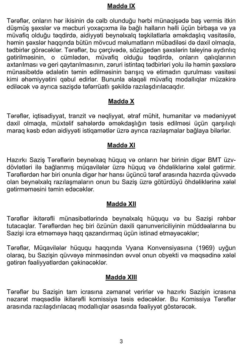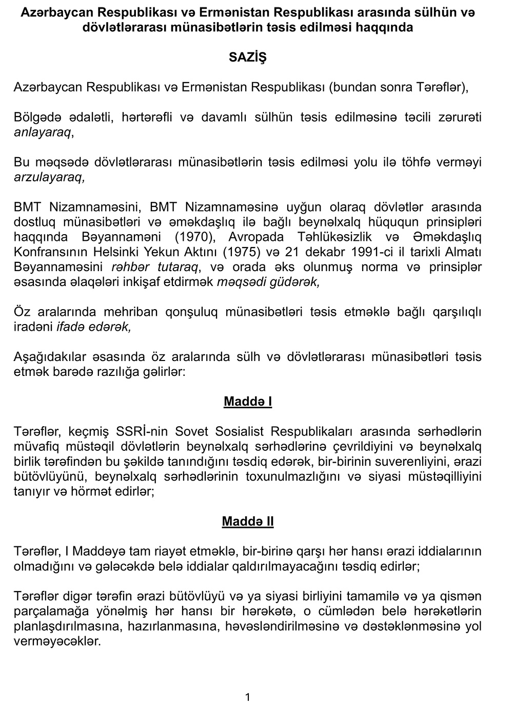 Azərbaycan Respublikası və Ermənistan Respublikası (bundan sonra Tərəflər), Bölgədə ədalətli, hərtərəfli və davamlı sülhün təsis edilməsinə təcili zərurəti anlayaraq,