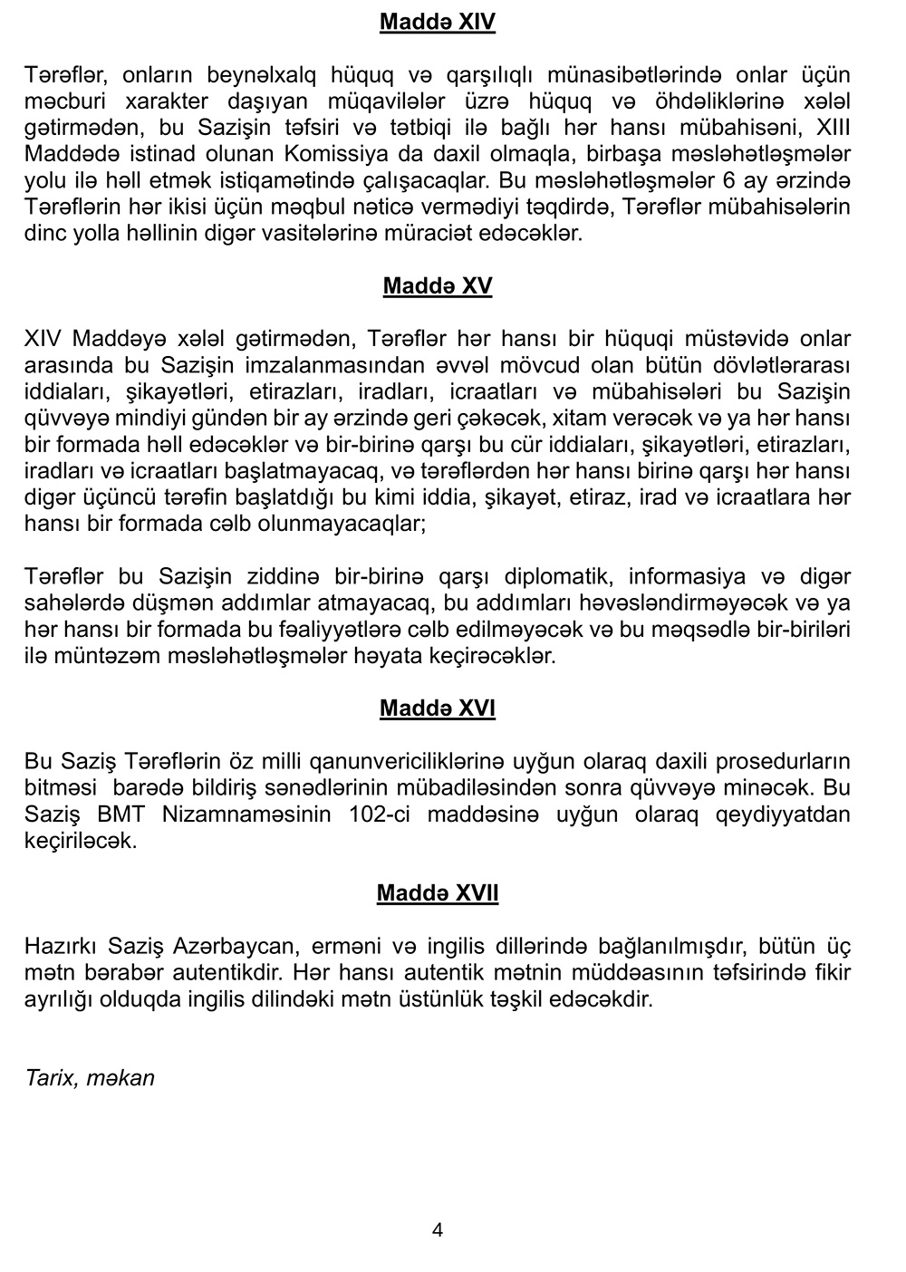 XIV Maddəyə xələl gətirmədən, Tərəflər hər hansı bir hüquqi müstəvidə onlar arasında bu Sazişin imzalanmasından əvvəl mövcud olan bütün dövlətlərarası iddiaları, şikayətləri, etirazları, iradları, icraatları və mübahisələri bu Sazişin qüvvəyə mindiyi gündən bir ay ərzində geri çəkəcək, xitam verəcək və ya hər hansı bir formada həll edəcəklər və bir-birinə qarşı bu cür iddiaları, şikayətləri, etirazları, iradları və icraatları başlatmayacaq, və tərəflərdən hər hansı birinə qarşı hər hansı digər üçüncü tərəfin başlatdığı bu kimi iddia, şikayət, etiraz, irad və icraatlara hər hansı bir formada cəlb olunmayacaqlar;