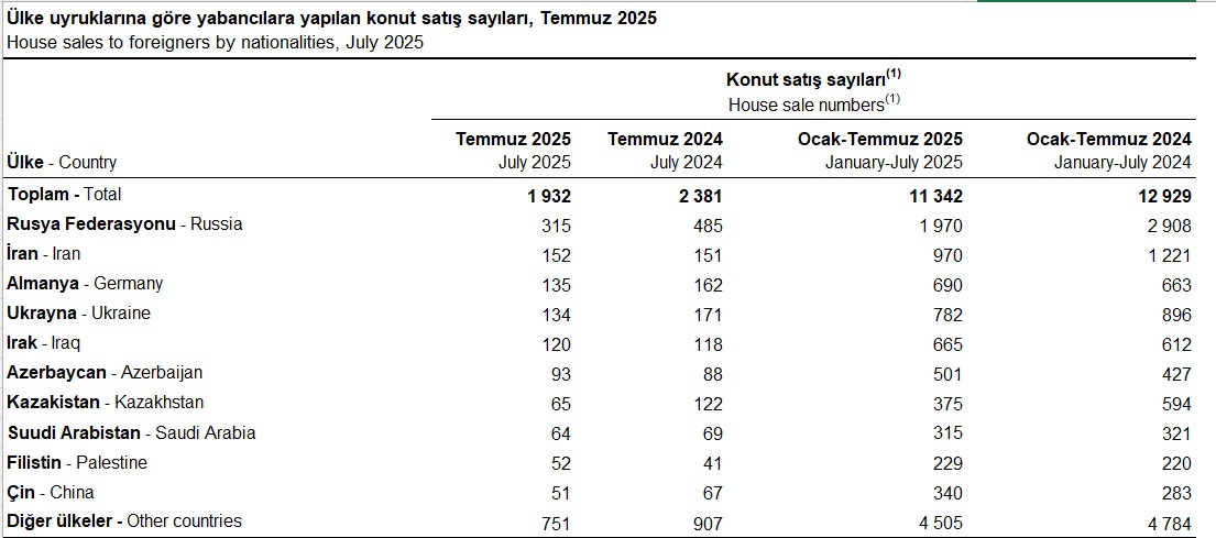 2025-ci ilin yanvar-iyul dövründə Türkiyədə xaricilərə mənzil satışı illik müqayisədə 12,1% azalaraq 11 min 267 ədəd olub. İyul ayında ümumi mənzil satışlarında xaricilərə satılan mənzillərin payı 1,3% təşkil edib.