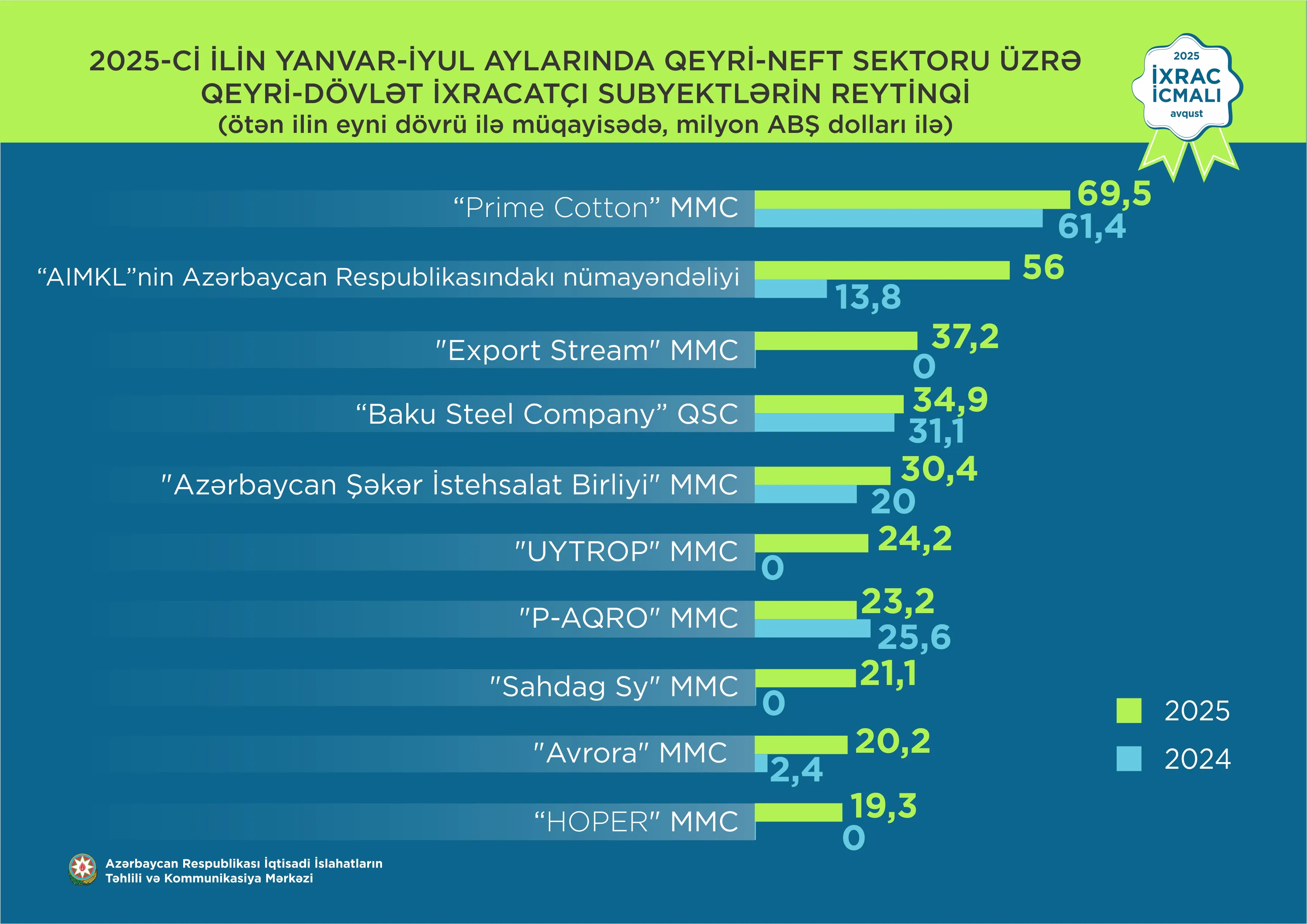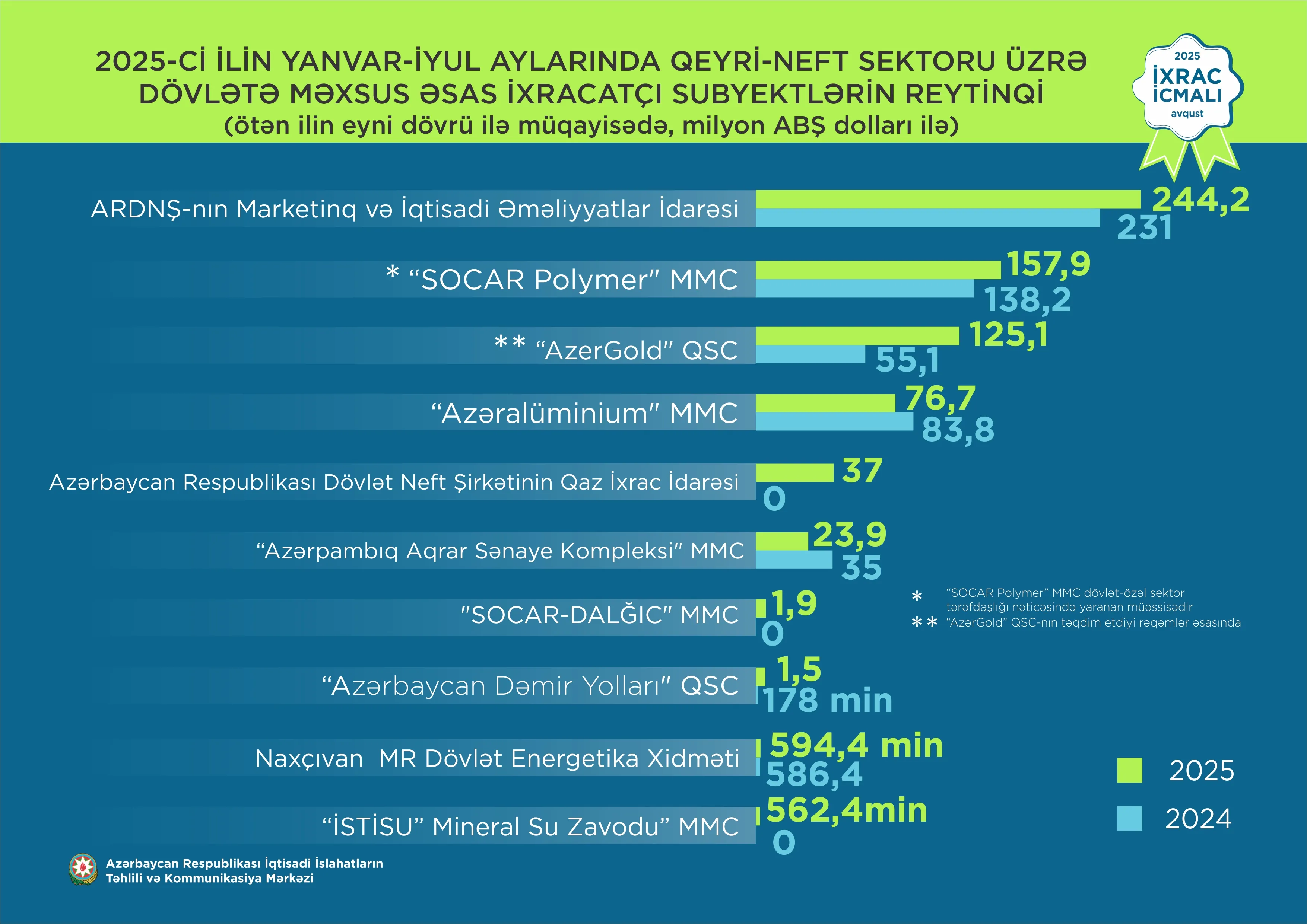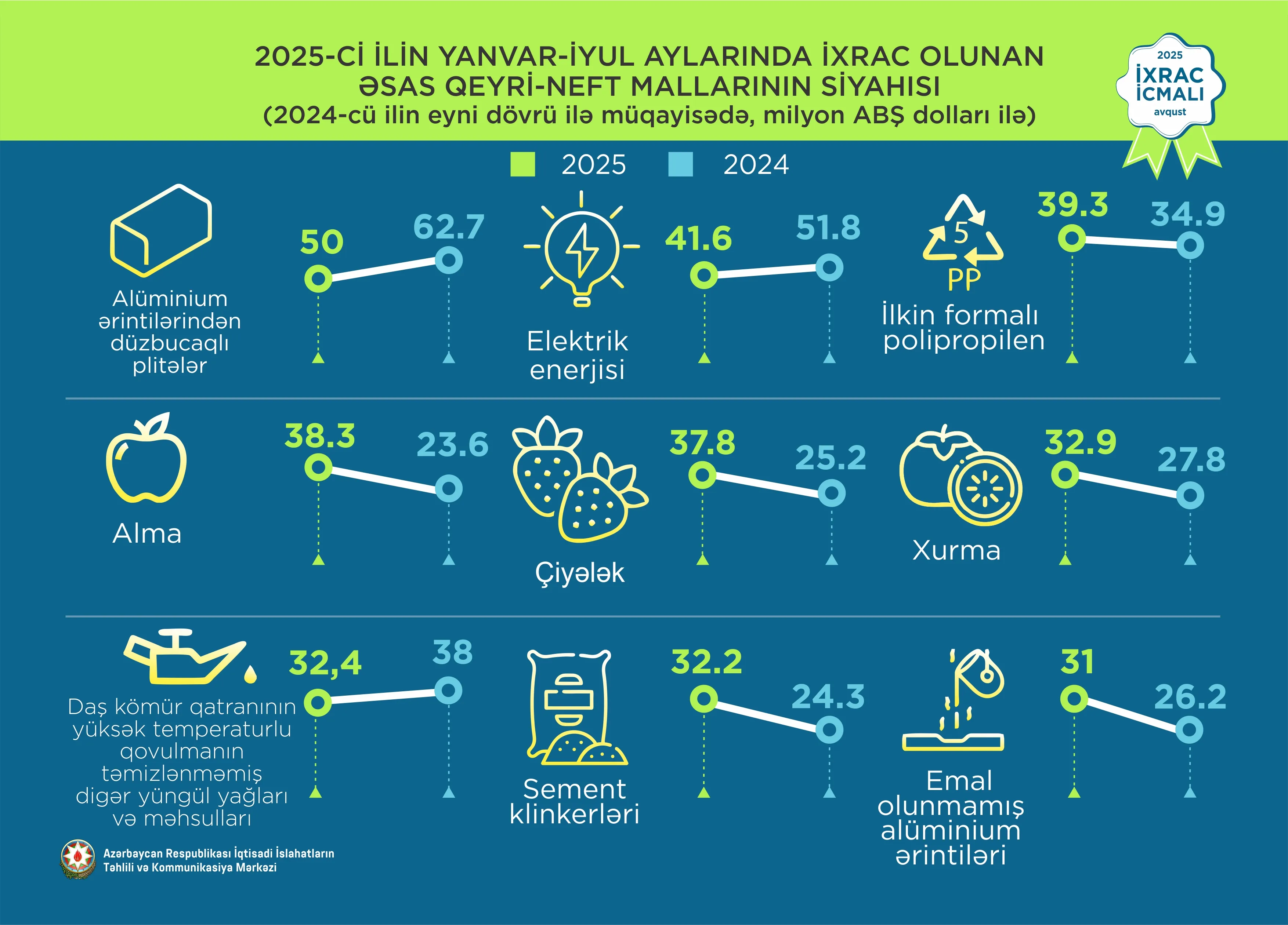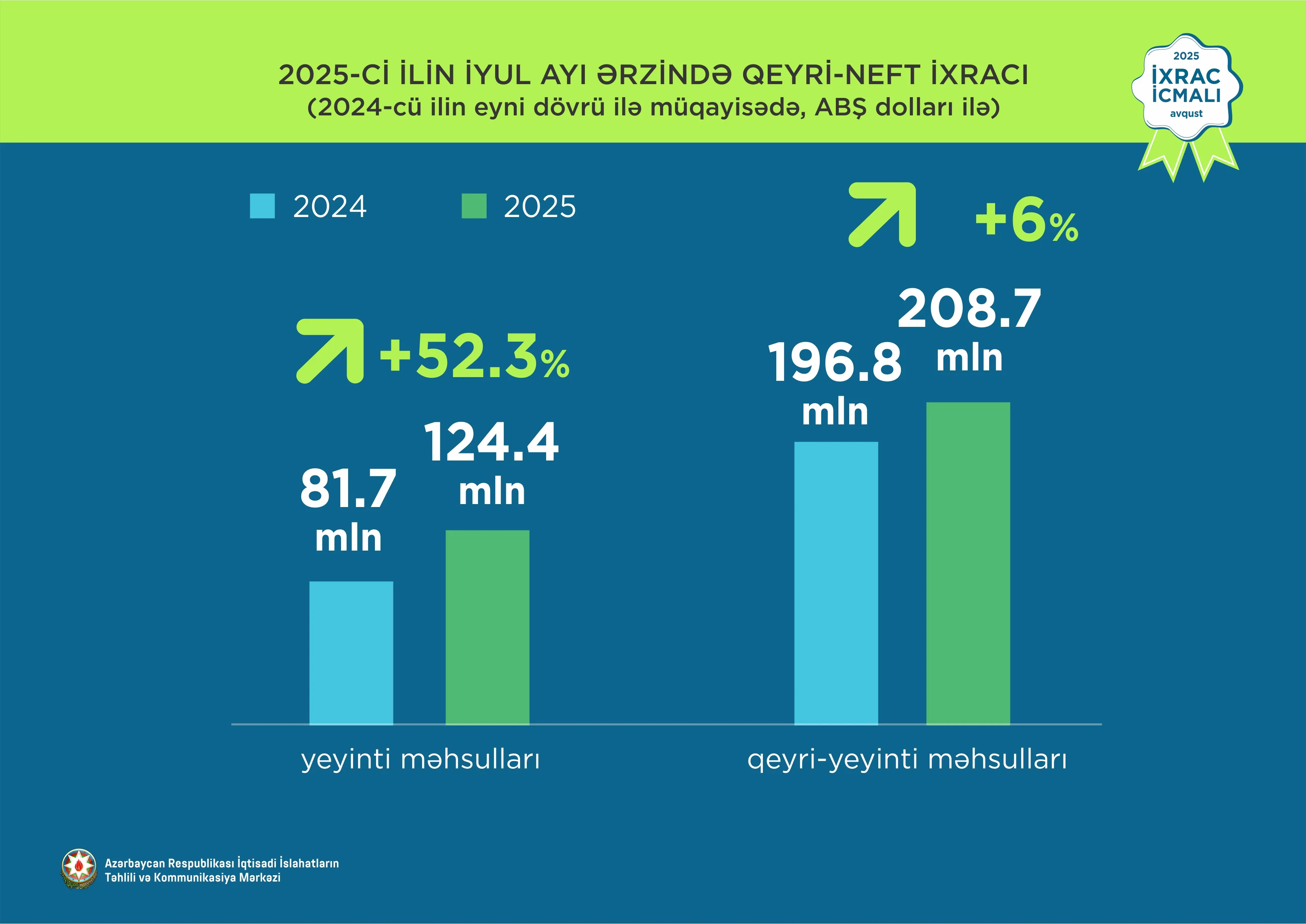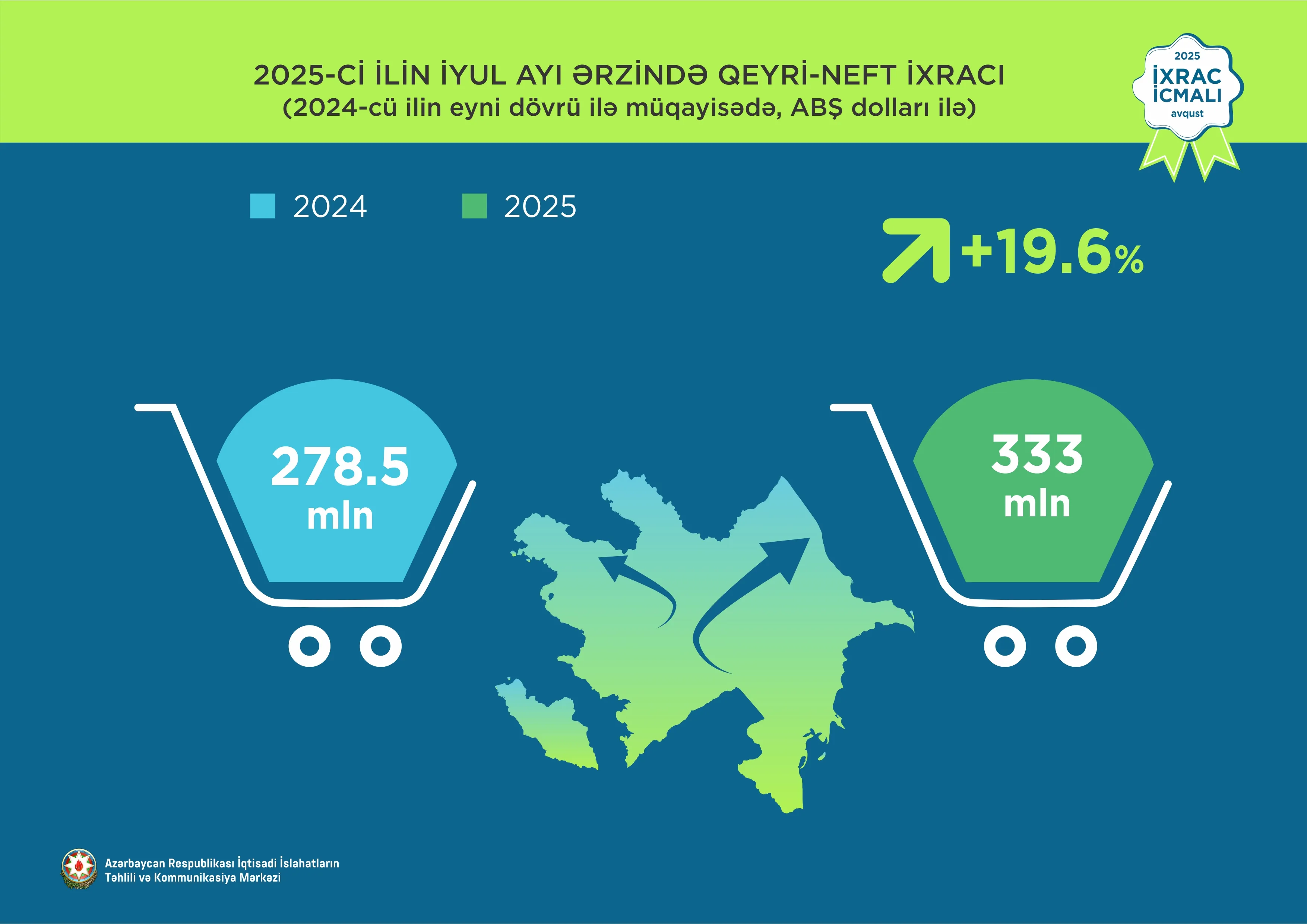 2025-ci ilin iyul ayında Rusiya Federasiyasına 130,6 milyon ABŞ dolları, Türkiyəyə 52,5 milyon ABŞ dolları, İsveçrəyə 34,3 milyon ABŞ dolları, Gürcüstana 28,7 milyon ABŞ dolları, Ukraynaya isə 14,1 milyon ABŞ dolları dəyərində qeyri-neft sektoruna aid mal ixrac edilib.