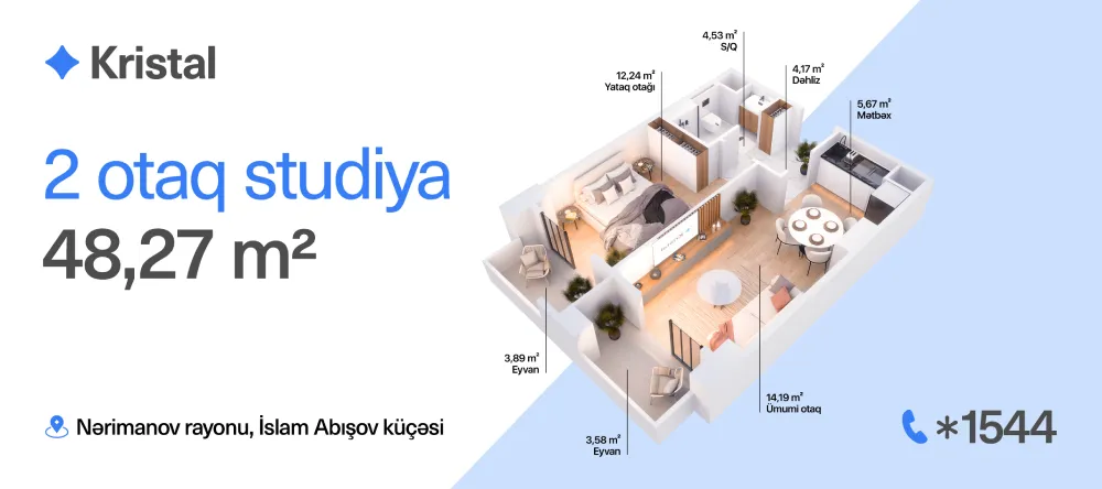 2 otaq studiya mənzil aylıq cəmi 957 manat!
