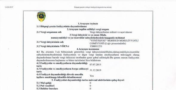 Müflis elan edilməsi barədə xəbər yayılmış "Yeni Həyat" MMC Zərifə Əliyeva 55 (binanın görüntüsü əlavə olunur) ünvanında yerləşən yaşayış binasının inşasını həyata keçirərək istismara təhvil vermişdir və 2015-ci il tarixindən etibarən rəsmi olaraq fəaliyyəti dayandırılmışdır (fəaliyyətin dayandırılması haqqında haqqında arayış əlavə olunur) və binaya xidmətin göstərilməsi üçün Hayat Management MMC-yə təhvil verilmişdir".