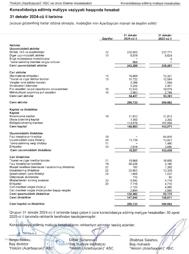 Həmçinin, 31 dekabr 2024-cü il tarixində "Holcim (Azərbaycan)" ASC 296 milyon 733 min manat cəmi aktivlərə malik olub (2023-cü ilin sonunda 299 milyon 682 min manat).