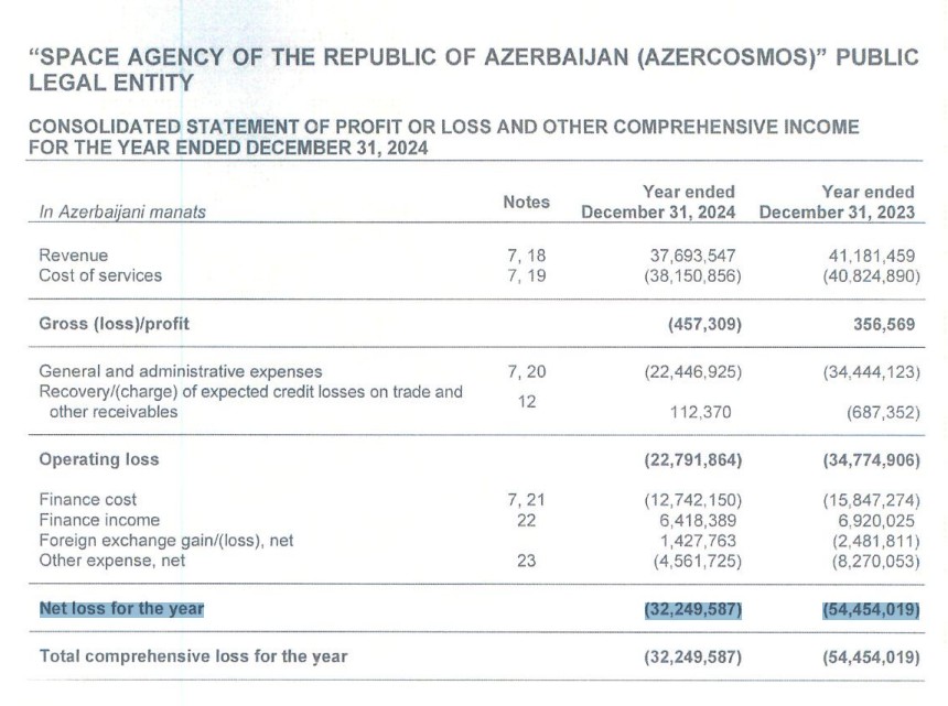 Marja.az maliyyə hesabatlarına istinadən xəbər verir ki, Azərkosmos-un əsas əməliyyat gəlirləri 2023-cü ildə 41 milyon 181 min manat ikən, 2024-cü ildə 37 milyon 693 min manata düşüb (3 milyon 488 min manat və ya 8,5% azalıb). Xidmətlərin maya dəyəri isə 2 milyon 675 min manat və ya 6,5% azalaraq 38 milyon 150 min manat təşkil edib.