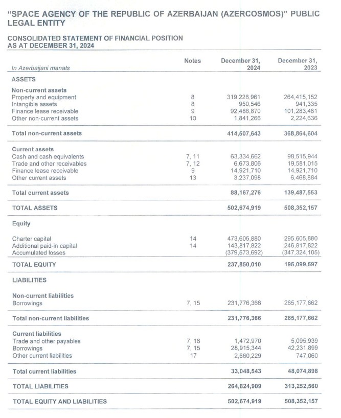 31 dekabr 2024-cü il tarixində Azərkosmos 502 milyon 675 min manat cəmi aktivlərə malik olub.
