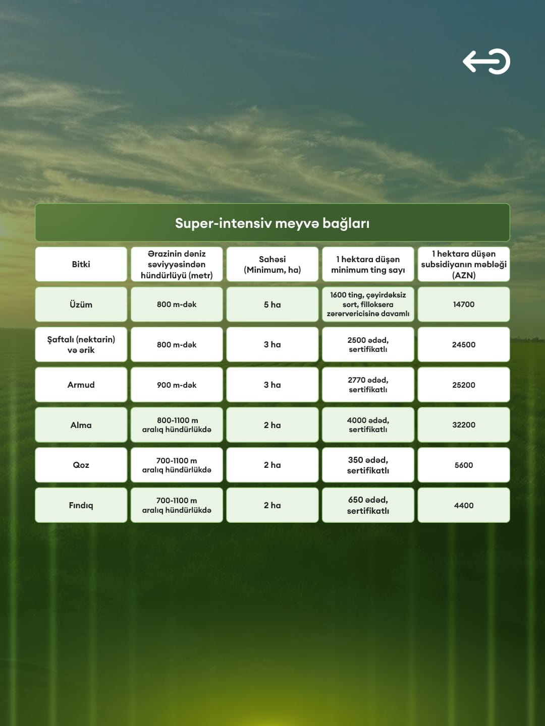 Nazirliyin yaydığı məlumatda bildirilir ki, yeni qaydalara əsasən, 2025-ci il sentyabrın 1-dən 2026-cı il mayın 31-dək Naxçıvanda salınacaq bir sıra meyvə bağlarına ölkədə indiyədək tətbiq olunmuş ən yüksək birdəfəlik subsidiya məbləğləri ödəniləcək.