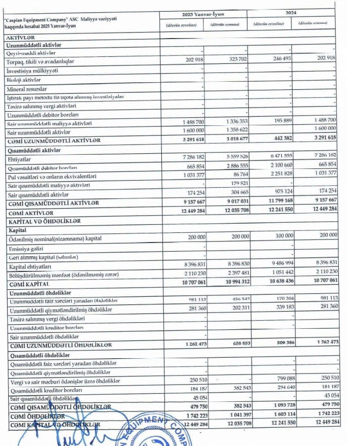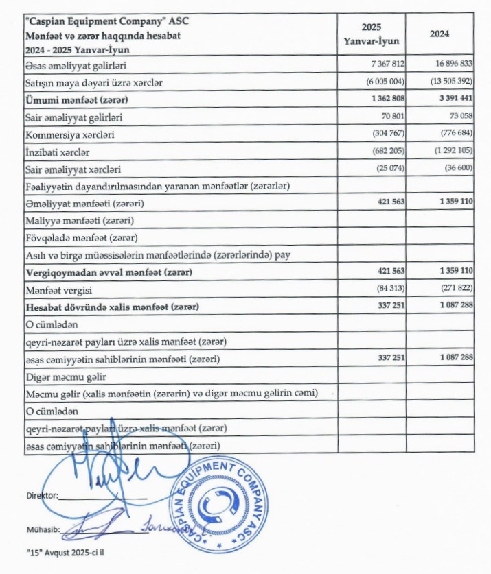 "Caspian Equipment Company" ilk 6 ayı xalis mənfəət ilə bağlayıb