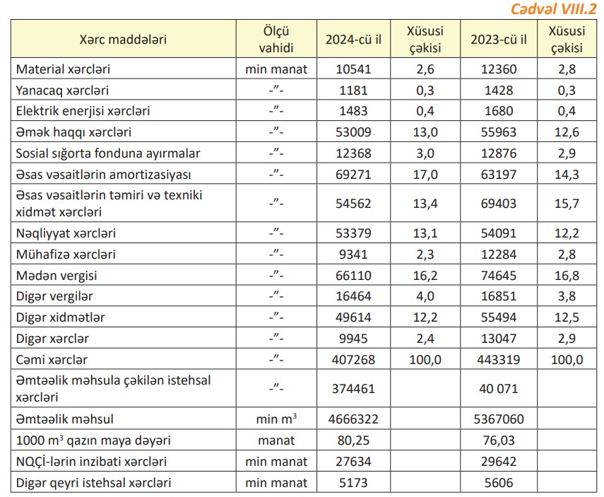 Qazın hasilatı na, “Azərkontrakt” SC-dən alışına və idxala çəkilən xərclərlə yanaşı, qazın emalı, saxlanması, nəqli və paylanması xərcləri də nəzərə alınmaqla 2024-cü ildə SOCAR üzrə satılan 1000 m3 (kub metr) qazın faktki xərci 176,82 manat (1 kub metr üçün təxminən 18 qəpik) təşkil etmişdir. Aşağıdakı cədvəldə əmtəəlik məhsul vahidinin maya dəyərinin (mədən vergisiz) göstəricisinin müqayisəsi verilmişdir.