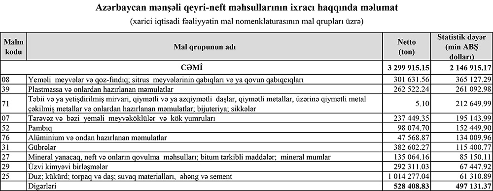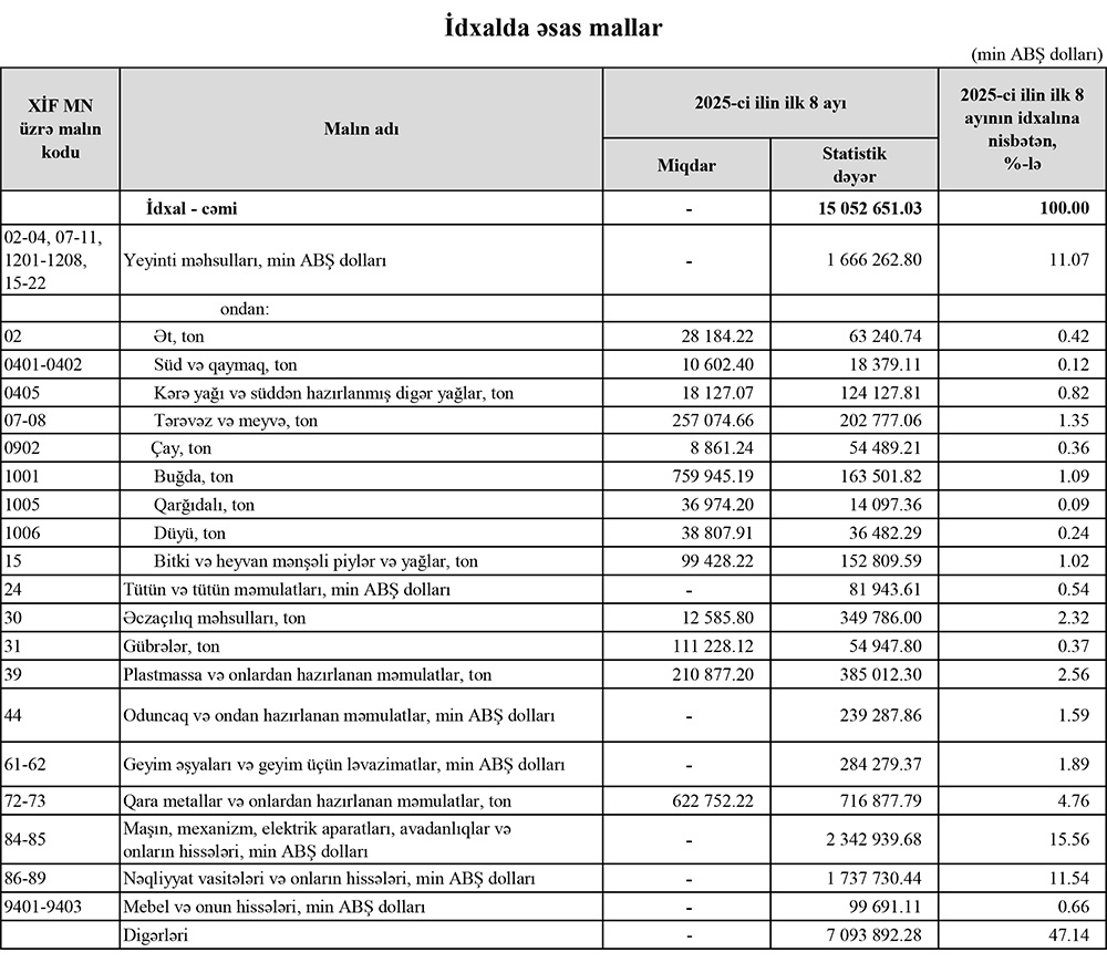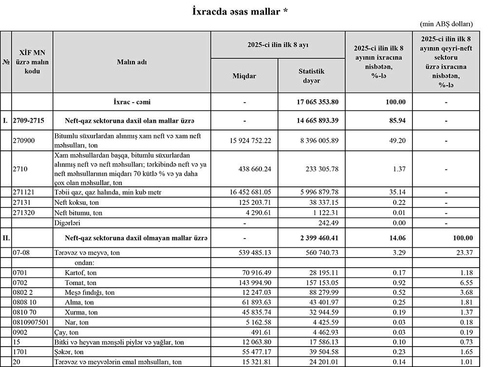 2025-cü ilin yanvar-avqust aylarında (8 ayda) Azərbaycanın ən çox ixrac və idxal etdiyi mallar.