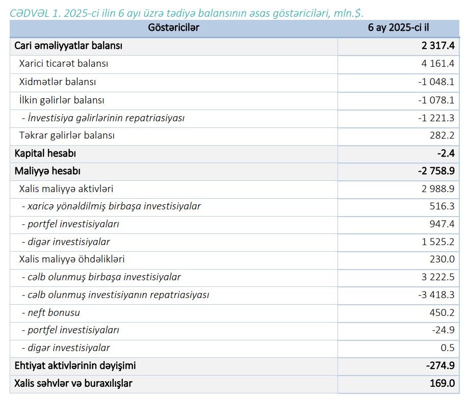 Tədiyyə balansında qeyd edilib ki, 2025-ci ilin 6 ayında tədiyə balansı qlobal əmtəə, xidmət və maliyyə bazarlarındakı qiymət və indekslərin dəyişkənliyindən təsirlənmişdir. Bu dövrdə cari əməliyyatlar balansında 2 milyard 317.4 milyon dollar həcmində profisit formalaşmış (2024-cü ilin eyni dövründə 2 milyard 625 milyon dollar), kapital və maliyyənin hərəkəti balansı üzrə xalis xarici maliyyə aktivləri 3 milyard dollar, xalis maliyyə öhdəlikləri isə 0.2 milyard dollar artmışdır. Hesabat dövründə cari əməliyyatlar balansının profisitinin ÜDM-ə nisbəti 6.3% təşkil etmişdir ki, bu da makroiqtisadi sabitlik baxımından müsbət haldır. Dövr ərzində ölkənin ehtiyat aktivlərinin reallaşmış hissəsi 274.9 milyon dollar azalmışdır. Bununla belə, ölkənin strateji valyuta aktivləri dövrün sonuna 6.7 milyard dollar artaraq 77.7 milyard dollara çatmışdır ki, bu da ölkənin makroiqtisadi dayanıqlılığının daha da gücləndiyini göstərir. Bu dövrdə xam neftin orta qiyməti 70.7 dollar/barel olmuşdur.