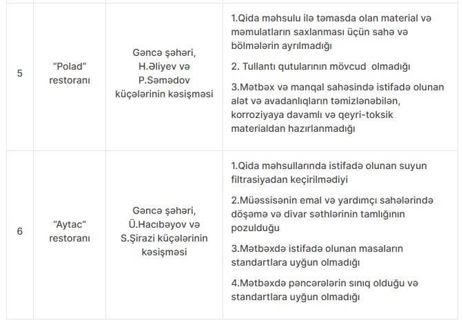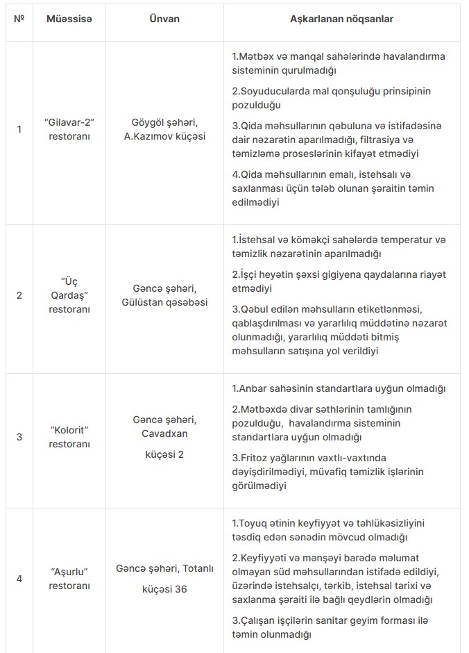 Gəncə və Göygöldəki restoranlarda yoxalama aparılır, nöqsanlar aşkar edilib - SİYAHI