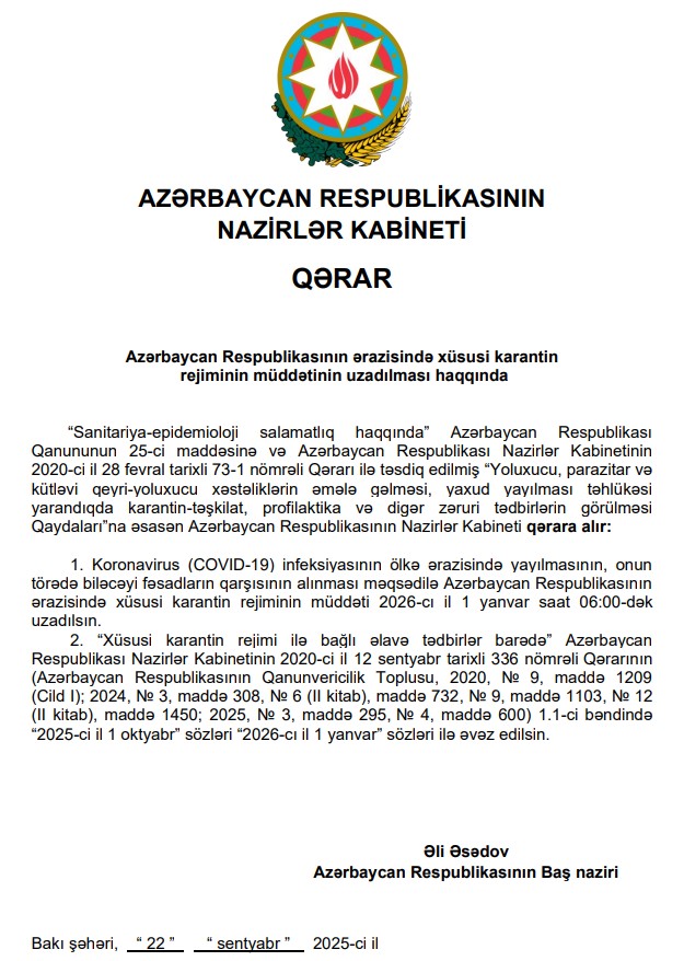 Qərara əsasən, koronavirus (COVID-19) infeksiyasının ölkə ərazisində yayılmasının, onun törədə biləcəyi fəsadların qarşısının alınması məqsədilə Azərbaycan Respublikasının ərazisində xüsusi karantin rejiminin müddəti 2026-cı il 1 yanvar saat 06:00-dək uzadılıb.