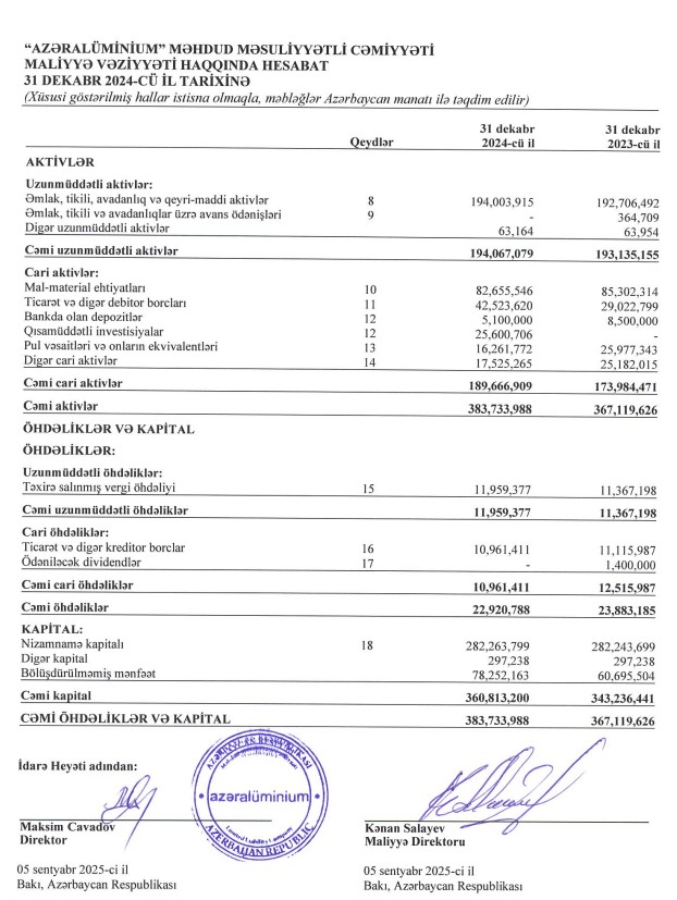 2024-cü ilin sonuna “Azəralüminium” MMC-nin cəmi aktivləri 383 milyon 734 min manat təşkil etmişdir ki, bu da əvvəlki ilin (367 milyon 120 min manat) göstəricisindən yüksəkdir. Aktivlərin artımı əsasən debitor borcların və qısamüddətli investisiyaların artması ilə bağlı olmuşdur. Bölüşdürülməmiş mənfəət 2023-cü ildəki 60 milyon 695 min manatdan 2024-cü ilin sonuna 78 milyon 252 min manata yüksəlmişdir. Qeyd edilib ki, bu göstərici şirkətin ardıcıl illər ərzində formalaşdırdığı sabit mənfəətlilik və gələcək investisiya imkanları üçün möhkəm baza olduğunu göstərir.