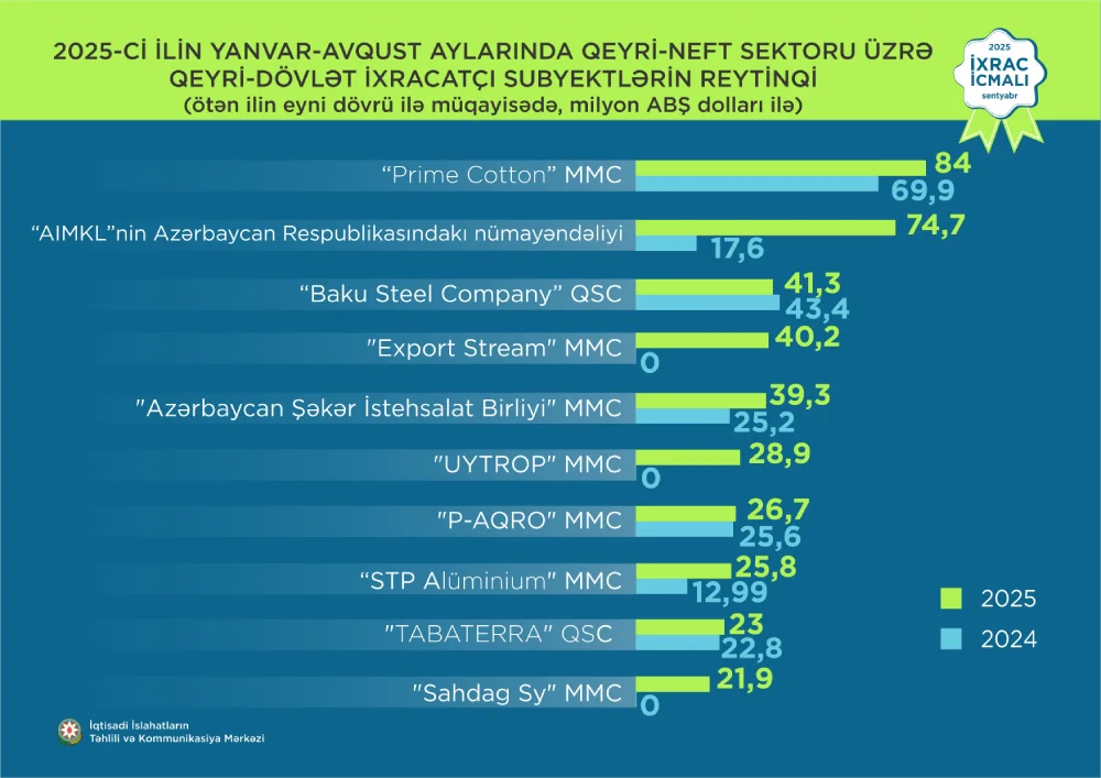Azərbaycanda digər qızıl istehsalçısı olan “AIMKL”nin Azərbaycan Respublikasındakı nümayəndəliyi 2025-ci ilin yanvar-avqust ayları ərzində qızıl ixracından 74,7 milyon dollar gəlir əldə edib. Bu, ötən ilin eyni dövrü ilə müqayisədə 57,1 milyon dollar və ya 4,2 dəfə çoxdur.