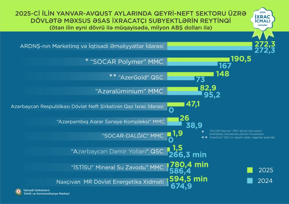 Marjaaz Marja.az İqtisadi İslahatların Təhlili və Kommunikasiya Mərkəzi (İİTKM) “İxrac icmalı”nın sentyabr sayını istinadən xəbər verir ki, 2025-ci ilin yanvar-avqust ayları ərzində “AzerGold" QSC-nin ixracdan gəliri 148 milyon ABŞ dolları təşkil edib. Bu, ötən ilin eyni dövrü ilə müqayisədə 75 milyon dollar və ya 2 dəfə çoxdur.