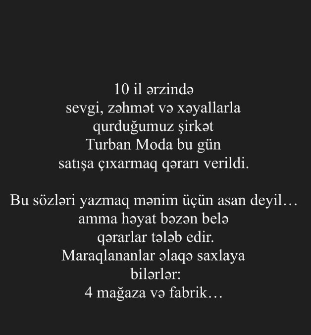 "10 il ərzində sevgi, zəhmət və xəyallarla qurduğumuz şirkət - "Turban Moda"nı bu gün satışa çaxarmaq qərarını verdik. Bu sözləri yazmaq mənim üçün asan deyil. Amma həyat bəzən belə qərarlar tələb edir. Maraqlananalar əlaqə saxlaya bilərlər: 4 mağaza və 1 fabrik", - iş qadını bildirirb.