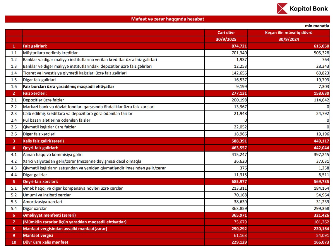 Kapital Bank 2025-ci ilin ilk doqquz ayında həm gəlirliliyini, həm də aktivlərini artıraraq bazardakı mövqeyini gücləndirib. Əməliyyat gəlirləri və mənfəətin artması, ehtiyatlara ayırmaların azalması və balans göstəricilərinin böyüməsi bankın dayanıqlı maliyyə performansını nümayiş etdirir.