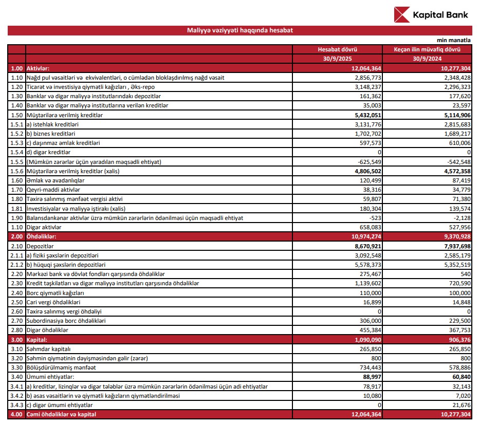 2025-ci ilin 30 sentyabr tarixinə Kapital Bank-ın cəmi aktivləri 12 milyard 64,4 milyon manat təşkil edib. Bu göstərici 2024-cü ilin eyni dövrü ilə müqayisədə 1 milyard 787,1 milyon manat və ya təxminən 17,4% artım deməkdir. Aktivlərin artımı əsasən kredit portfelinin genişlənməsi, eləcə də depozit bazasının böyüməsi ilə əlaqələndirilir.