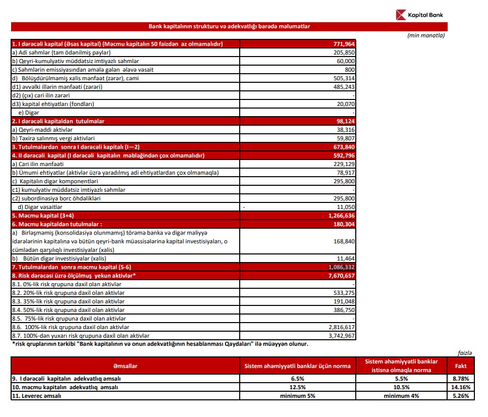 Bankın məcmu kapitalı 2025-ci ilin 30 sentyabr tarixinə 1 milyard 86,3 milyon manat, 2024-cü ilin sonuna isə 976,6 milyon manat olub. Artım 109,7 milyon manat və ya 11,2% təşkil edib.