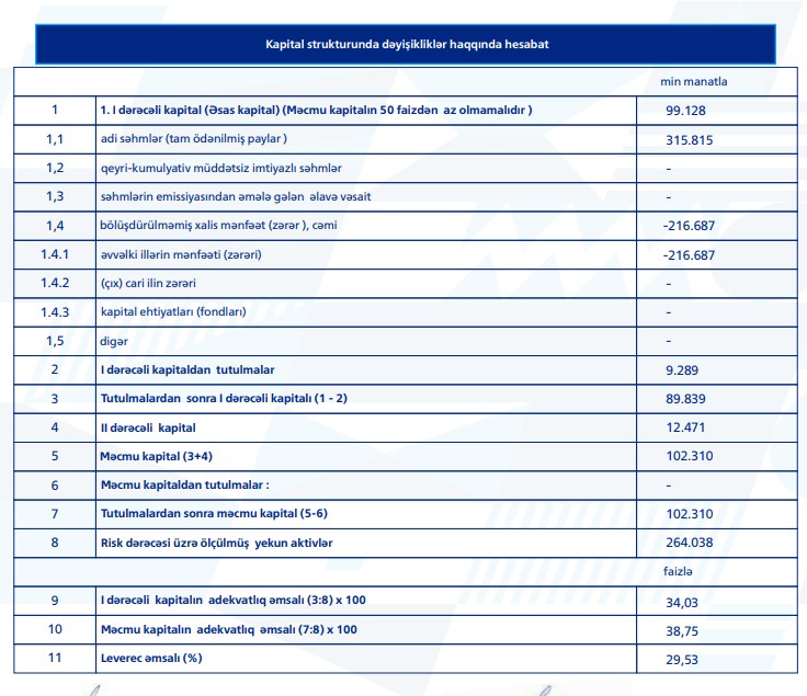 30 sentyabr 2025-ci il tarixinə Bankın məcmu kapitalı 102 milyon 310 min manat olub. Bu, 31 dekabr 2024-cü il tarixi ilə müqayisədə 92 milyon 252 min manatdan 10,9% artım deməkdir. Bankın kapital artımı onun dayanıqlılığını və risk idarəetmə mövqeyinin möhkəmləndiyini göstərir.