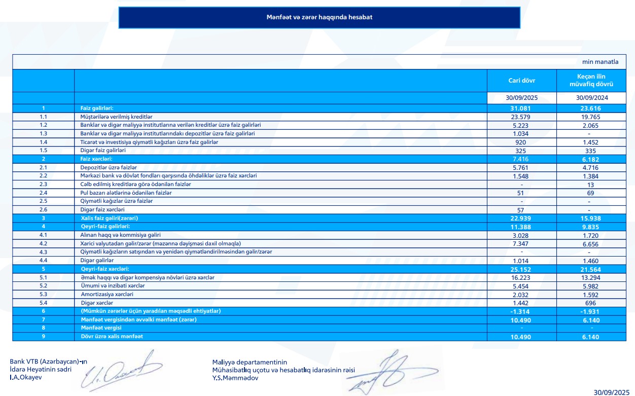 2025-ci ilin 9 ayında “Bank VTB (Azərbaycan)”ın faiz xərcləri 7 milyon 416 min manat təşkil edib, bu da keçən illə müqayisədə 20% artım deməkdir (6 milyon 182 min manat).