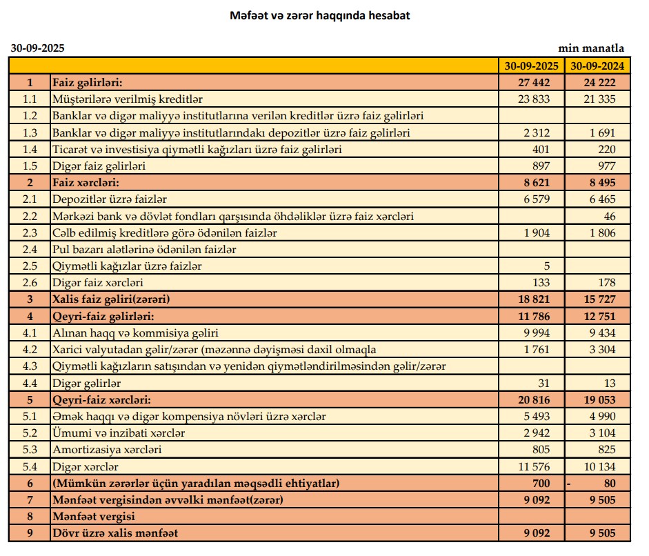 Ötən ilin 9 ayında Bankın cəmi əməliyyat gəlirləri 36 milyon 973 min manat, cəmi əməliyyat xərcləri 27 milyon 548 min manat, əməliyyat mənfəəti 9 milyon 425 min manat, eyni zamanda, mümkün zərərlər üçün yaradılan məqsədli ehtiyatlardan azad olmuş 80 min manat mənfəətə əlavə olunduğundan 9 milyon 505 manat xalis mənfəət əldə etmişdir.