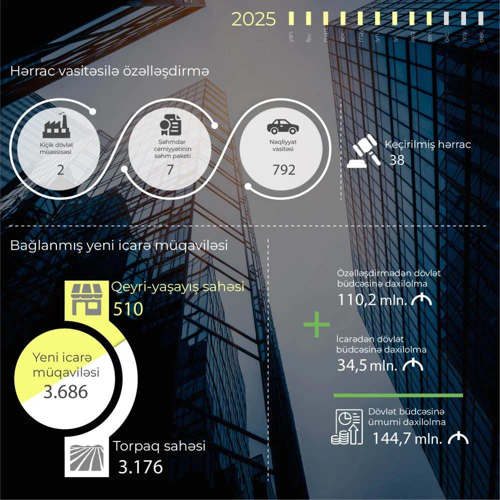Dövlət əmlakının özəlləşdirilməsi və icarəyə verilməsi sahəsində işlər davam edir. İqtisadiyyat Nazirliyi yanında Əmlak Məsələləri Dövlət Xidməti tərəfindən 2025-ci ilin yanvar-sentyabr ayları ərzində 38 hərrac keçirilib. Hərraclarda 7 səhmdar cəmiyyətinin səhm paketi, 2 kiçik dövlət müəssisəsi, 792 nəqliyyat vasitəsi özəlləşdirilib.
