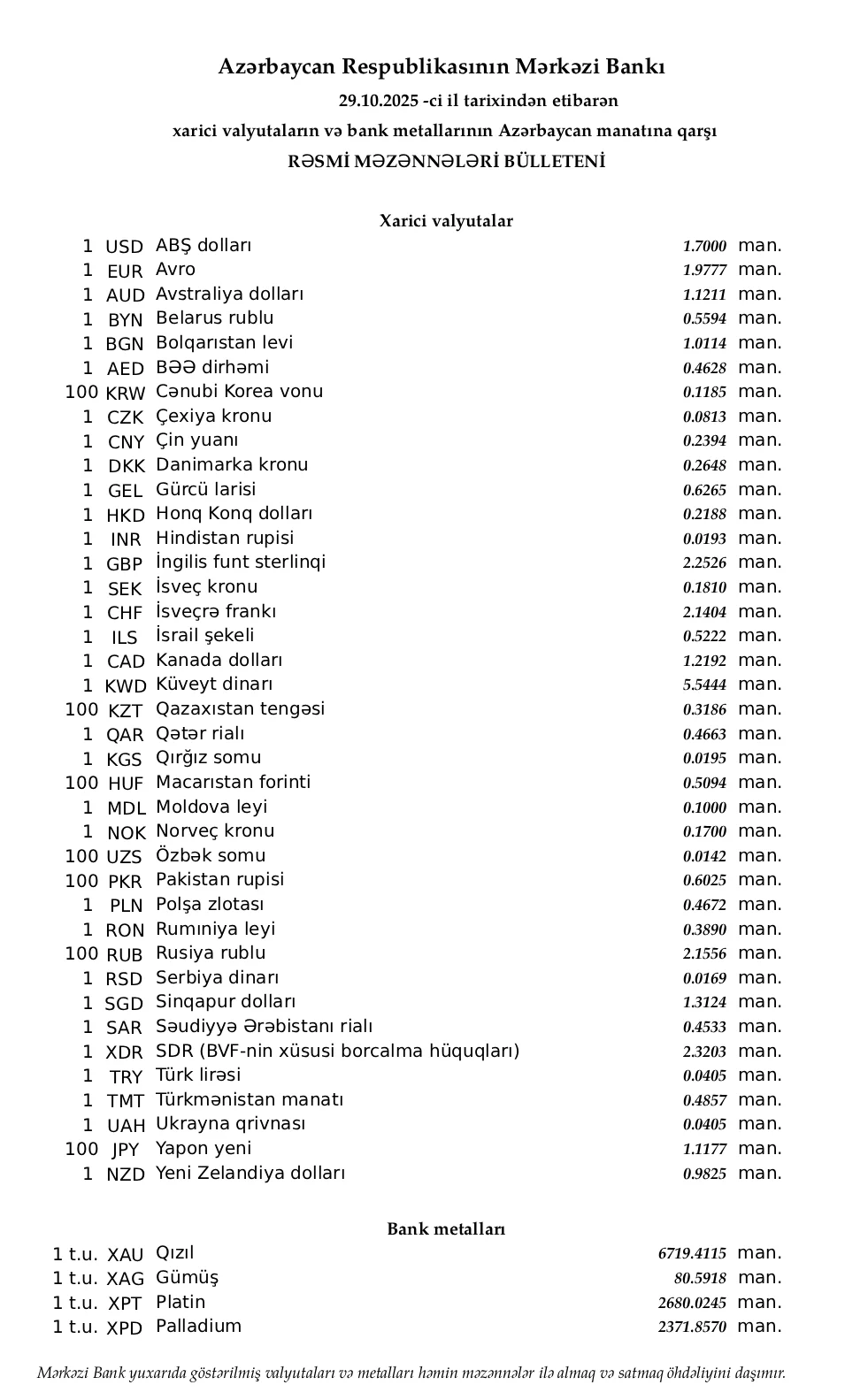 Rəsmi məzənnələr açıqlandı