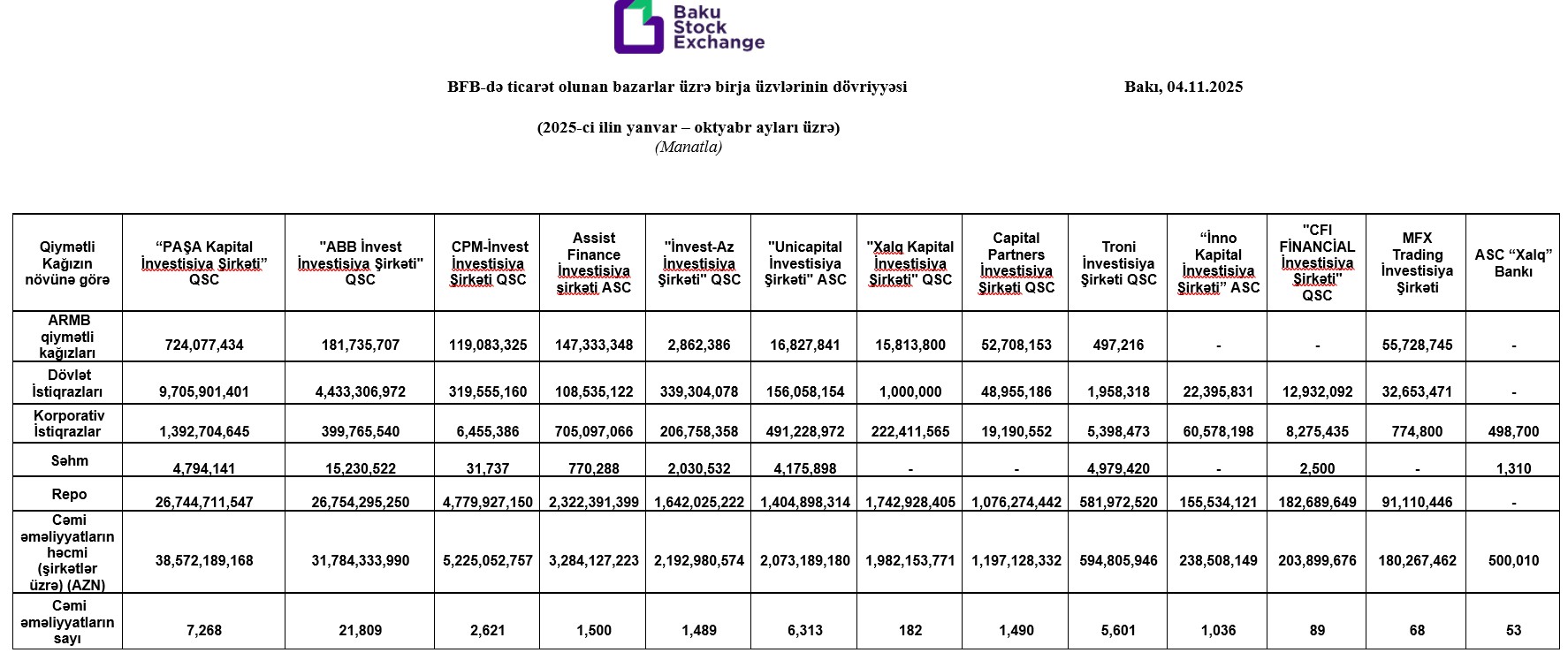 Birjadan Marja-ya verilən məlumata görə, 2025-ci ilin yanvar-oktyabr ayları ərzində “PAŞA Kapital İnvestisiya Şirkəti” QSC 38 milyard 572 milyon 189 manat dövriyyə ilə 1-ci, "ABB İnvest İnvestisiya Şirkəti" QSC 31 milyard 784 milyon 332 min manat dövriyyə ilə 2-ci, "CPM-İnvest İnvestisiya Şirkəti" QSC 5 milyard 225 milyon 53 min manat dövriyyə ilə 3-cü, "Assist Finance İnvestisiya şirkəti "ASC 3 milyard 284 milyon 127 min manat dövriyyə ilə 4-cü, "İnvest-AZ İnvestisiya Şirkəti" QSC 2 milyard 192 milyon 980 min manat dövriyyə ilə 5-ci, "Unicapital" 2 milyard 73 milyon 189 min manat dövriyyə ilə 6-cı olub.