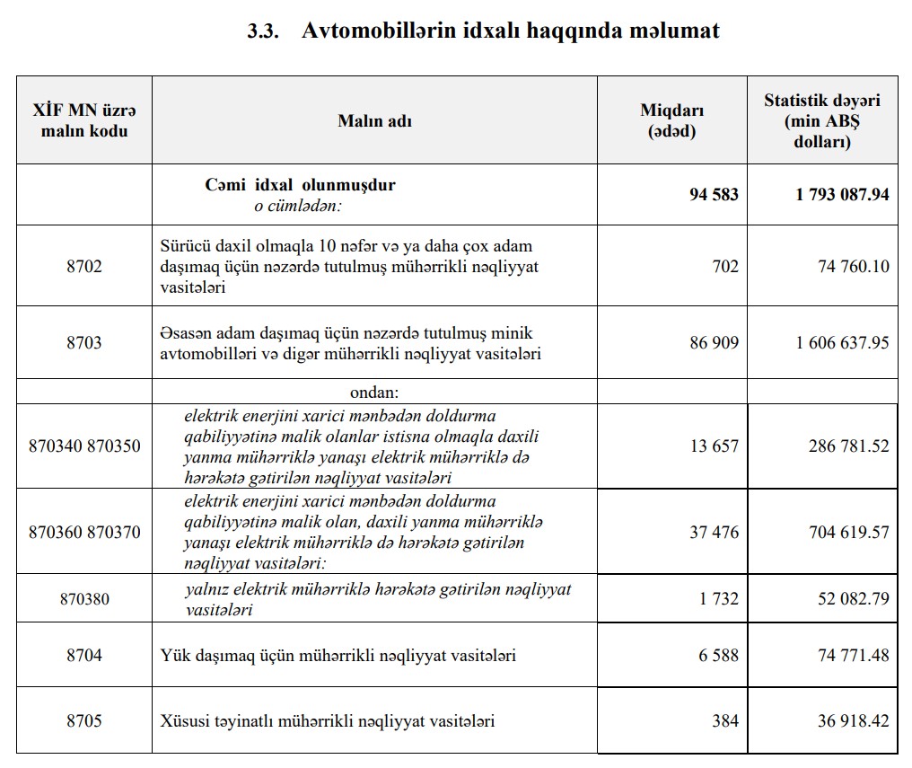 Beləliklə, bu il Azərbaycana avtomobil idxalı dəyər ifadəsilə 308 milyon 671 min dollar və ya 20,8%, miqdar ifadəsilə 19 min 860 ədəd və ya 26,8% artıb.