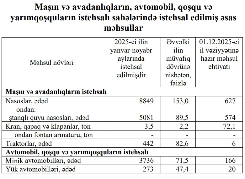 2025-сi ilin yanvar-oktyabr aylarında Azərbaycanda 3280 ədəd və ya əvvəlki ilin müvafiq dövrü ilə müqayisədə 1153 ədəd az (-26%) minik avtomobili istehsal olunmuşdu. Traktorların istehsalı 13,7 faiz, yük avtomobillərinin istehsalı isə 31,6 faiz azalmışdı.