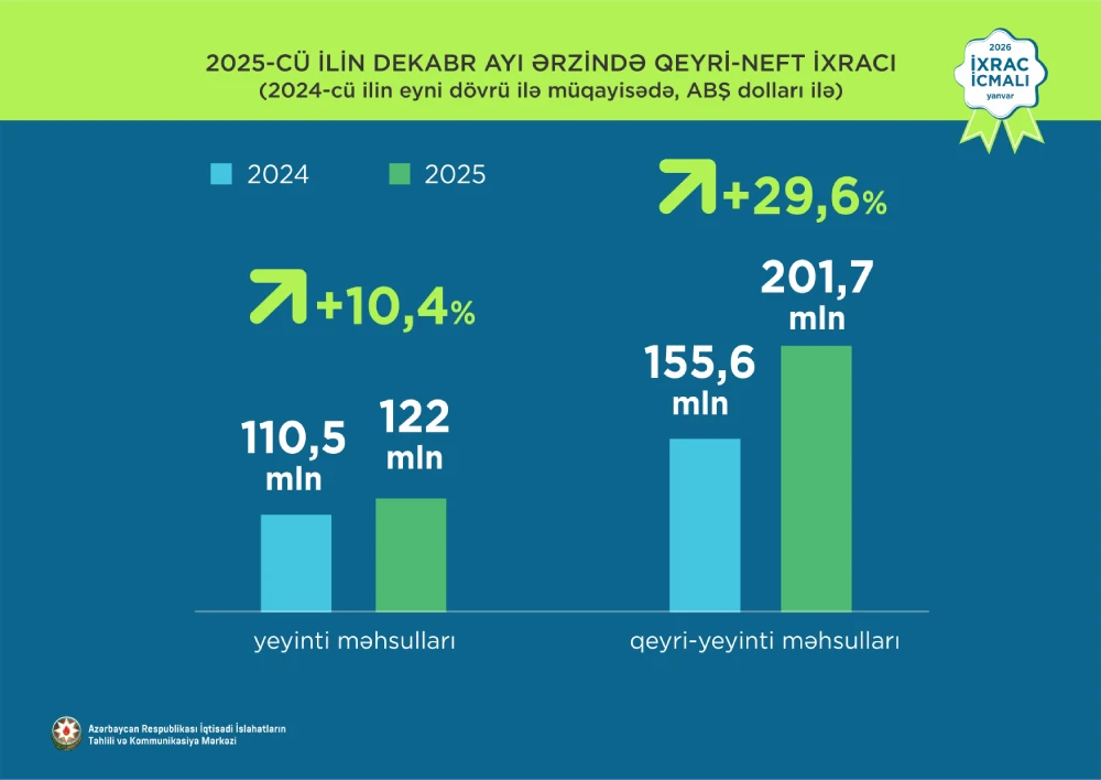 Marja xəbər verir ki, İcmala əsasən, 2025-ci ilin yanvar-dekabr aylarında  Azərbaycanın qeyri-neft sektoru üzrə ixracı 2024-cü ilin müvafiq dövrü ilə müqayisədə 8,5% artaraq 3,6 milyard ABŞ dolları təşkil edib. 2025-ci ilin yanvar-dekabr aylarında yeyinti məhsulları üzrə ixrac 18,4% artaraq 1,2 milyard ABŞ dollarına bərabər olub.