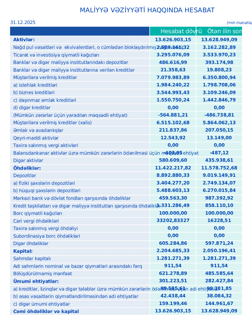 Bununla yanaşı, kredit portfeli (müştərilərə verilmiş cəmi kreditlər) əhəmiyyətli artım nümayiş etdirib. 2025-ci ilin sonuna müştərilərə verilmiş kreditlərin həcmi 7 milyard 79 milyon 984 min manata çatıb. 2024-cü ilin sonunda kredit portfeli 6 milyard 350 milyon 801 min manat idi. Beləliklə, portfel 729 milyon 183 min manat və ya 11,5% artıb. Bu, bankın real sektorun və əhalinin kreditləşdirilməsində aktiv mövqeyini qoruduğunu göstərir.