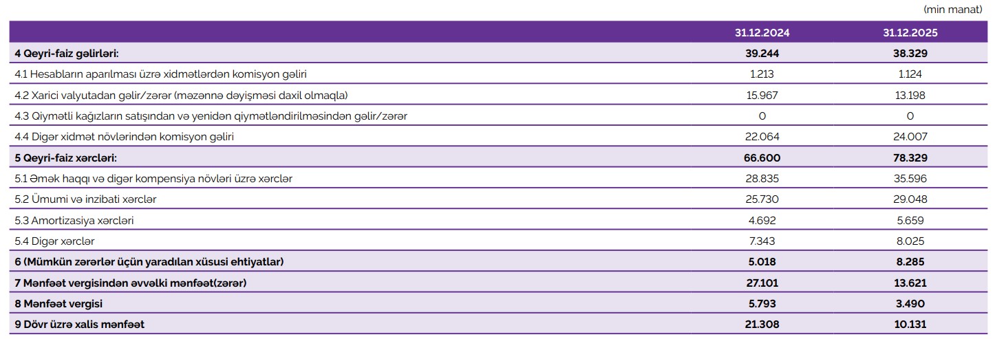 Qeyri-faiz gəlirləri isə 38 milyon 329 min manat təşkil edib. Bu göstərici 2024-cü illə müqayisədə 915 min manat və ya 2,3 faiz azalıb və ümumi gəlirlərin artım tempini qismən məhdudlaşdırıb.