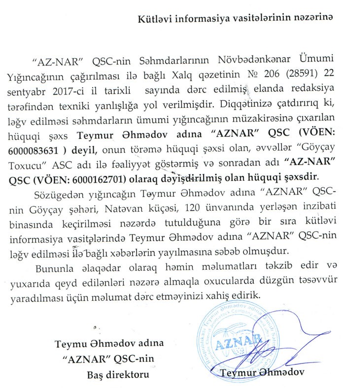 "Cəmiyyətin bütün səhmdarlarına izah olunur ki, səhmdarlar növbədənkənar ümumi yığıncağın çağırılmasına 15 gün qalmış gündəliyə daxil olan məsələlər üzrə müvafiq materiallarla Teymur Əhmədov adına "Aznar" QSC-nin inzibati binasında tanış olmaq olar hüququna malikdirlər", - deyə elanda vurğulanıb.