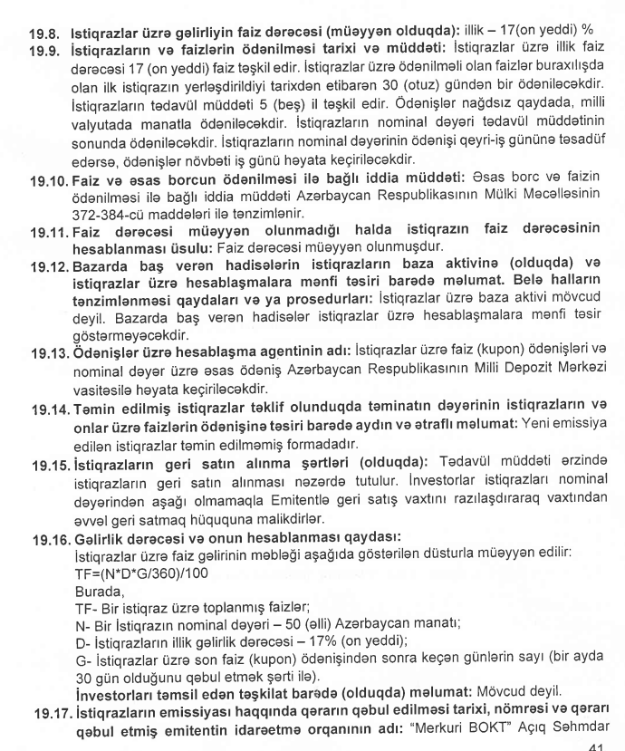 Marja.az istiqrazların Emissiya Prospektinə istinadən xəbər verir ki, BOKT hər birinin nominal dəyəri 50 manat olan 22 min ədəd adlı, faizli, sənədsiz, təmin edilməmiş istiqraz buraxıb.
