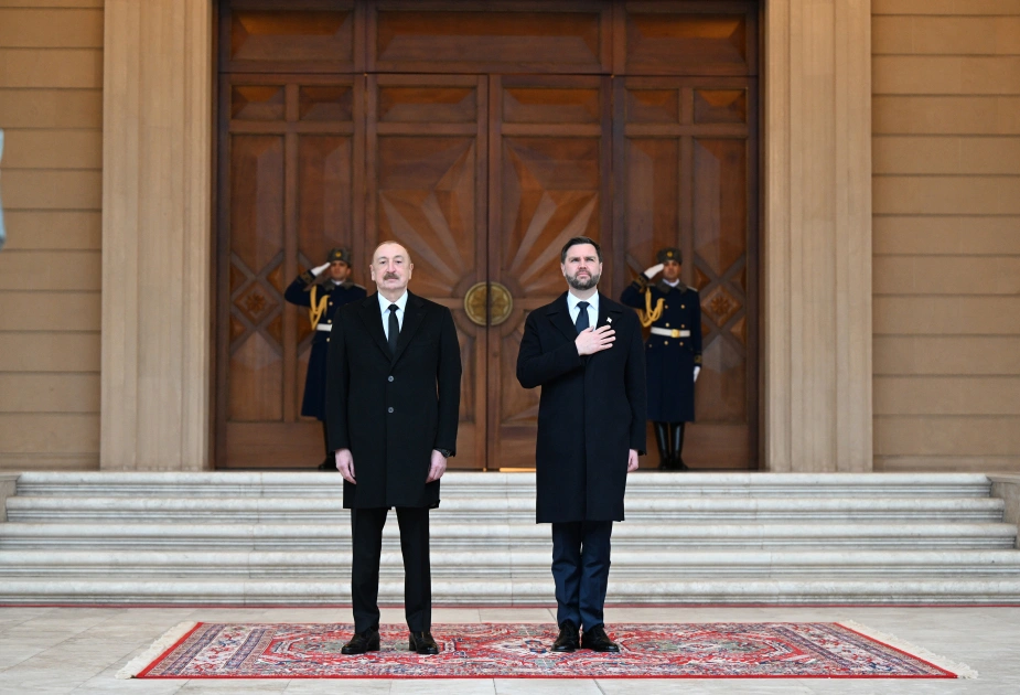 Fəxri qarovul dəstəsi hərbi marşın sədaları altında Azərbaycan Prezidenti İlham Əliyevin və Amerika Birləşmiş Ştatlarının Vitse-prezidenti Ceyms Devid Vensin qarşısından keçdi.