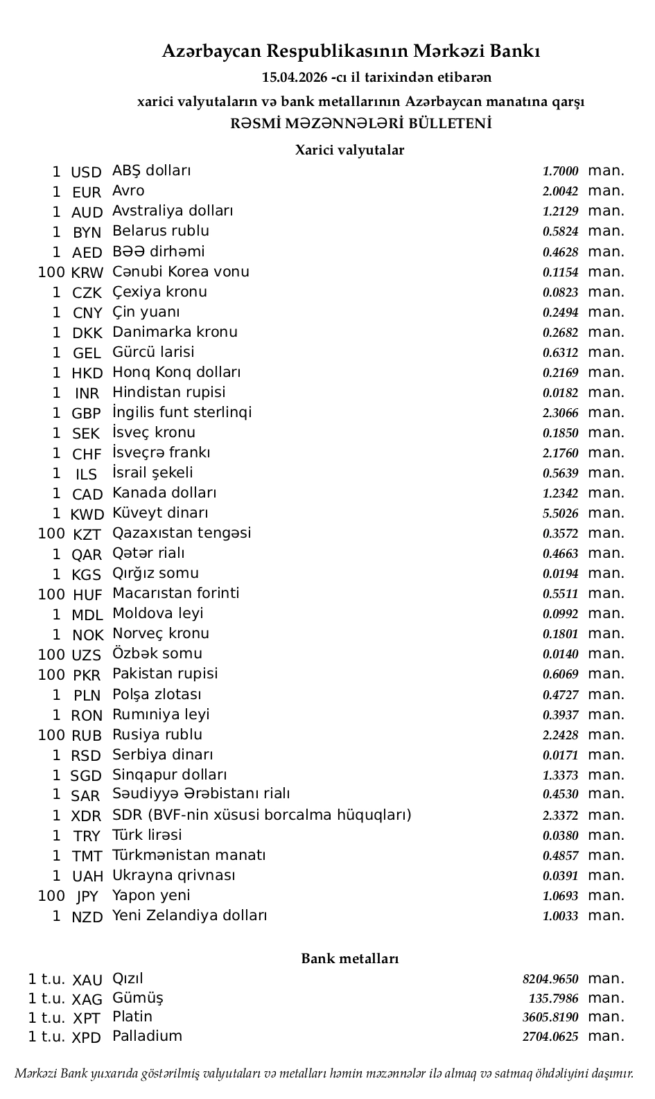 Rəsmi məzənnələr açıqlandı