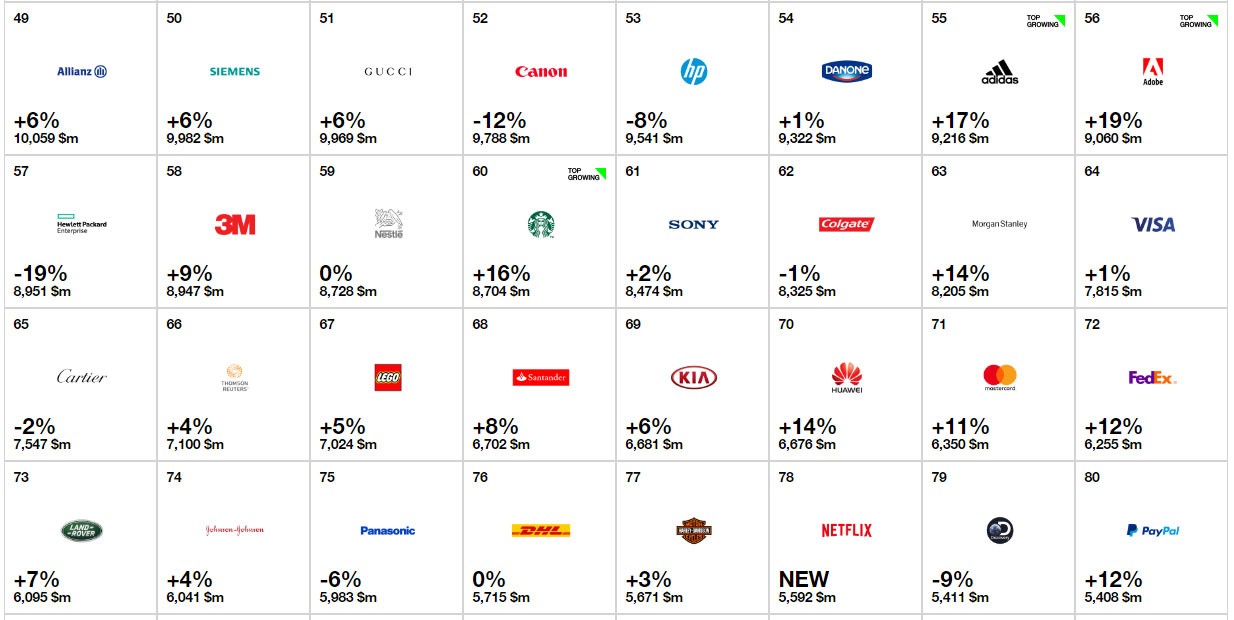 "Interbrand" hər il hazırladığı dünyanın ən qiymətli (dəyərli) markalarının siyahısını yayıb. "Marja" xəbər verir ki, siyahıya girmək üçün, şirkətin 3 qitədə satış etməli və gəlirlərinin üçdə biri beynəlxalq olmalıdır.