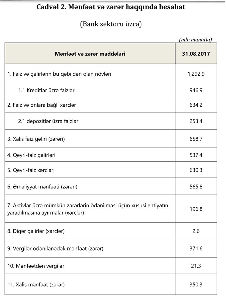2017-ci ilin 31 avqust tarixinə olan bank sektorunun əsas göstəriciləri bank sektorunun icmal göstəricilərində öz əksini tapmışdır.