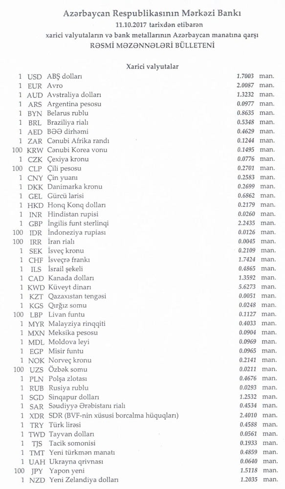 Oktyabrın 11-nə Mərkəzi Bankın açıqladığı rəsmi Dollar/manat məzənnəsi Oktyabrın 10-nu ilə müqayisədə qalxaraq 1,7003 manat olub, Avro/manat məzənnəsi 2.0087 manata, Rubl/manat məzənəsi isə 0,0293 manatda qalxıb.